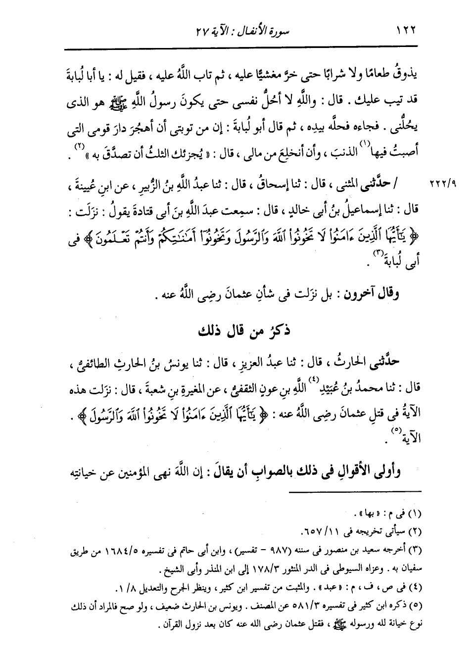 حَدَّثَنِي الْمُثَنَّى، قَالَ: ثنا إِسْحَاقُ، قَالَ: ثنا عَبْدُ اللَّهِ بْنُ الزُّبَيْرِ، عَنِ ابْنِ عُيَيْنَةَ، قَالَ: ثنا إِسْمَاعِيلُ بْنُ أَبِي خَالِدٍ، قَالَ: سَمِعْتُ عَبْدَ اللَّهِ بْنَ أَبِي قَتَادَةَ، يَقُولُ: " نَزَلَتْ: {يَا أَيُّهَا الَّذِينَ آمَنُوا §لَا تَخُونُوا اللَّهَ وَالرَّسُولَ وَتَخُونُوا أَمَانَاتِكُمْ وَأَنْتُمْ تَعْلَمُونَ} [الأنفال: 27] فِي أَبِي لُبَابَةَ " وَقَالَ آخَرُونَ: بَلْ نَزَلَتْ فِي شَأْنِ عُثْمَانَ رَضِيَ اللَّهُ عَنْهُ
