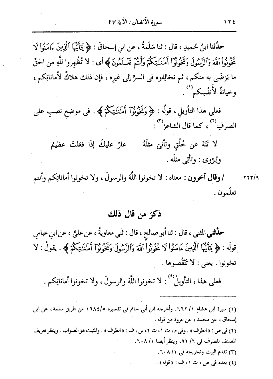 حَدَّثَنَا ابْنُ حُمَيْدٍ، قَالَ: ثنا سَلَمَةُ، عَنِ ابْنِ إِسْحَاقَ: " {يَا أَيُّهَا الَّذِينَ آمَنُوا §لَا تَخُونُوا اللَّهَ وَالرَّسُولَ وَتَخُونُوا أَمَانَاتِكُمْ وَأَنْتُمْ تَعْلَمُونَ} [الأنفال: 27] أَيْ: لَا تُظْهِرُوا لِلَّهِ مِنَ الْحَقِّ مَا يَرْضَى بِهِ مِنْكُمْ ثُمَّ تُخَالِفُوهُ فِي السِّرِّ إِلَى غَيْرِهِ، فَإِنَّ ذَلِكَ هَلَاكٌ لِأَمَانَاتِكُمْ وَخِيَانَةٌ لِأَنْفُسِكُمْ " فَعَلَى هَذَا التَّأْوِيلَ، قَوْلُهُ: {وَتَخُونُوا أَمَانَاتِكُمْ} [الأنفال: 27] فِي مَوْضِعِ نَصْبٍ عَلَى الظَّرْفِ. كَمَا قَالَ الشَّاعِرُ: