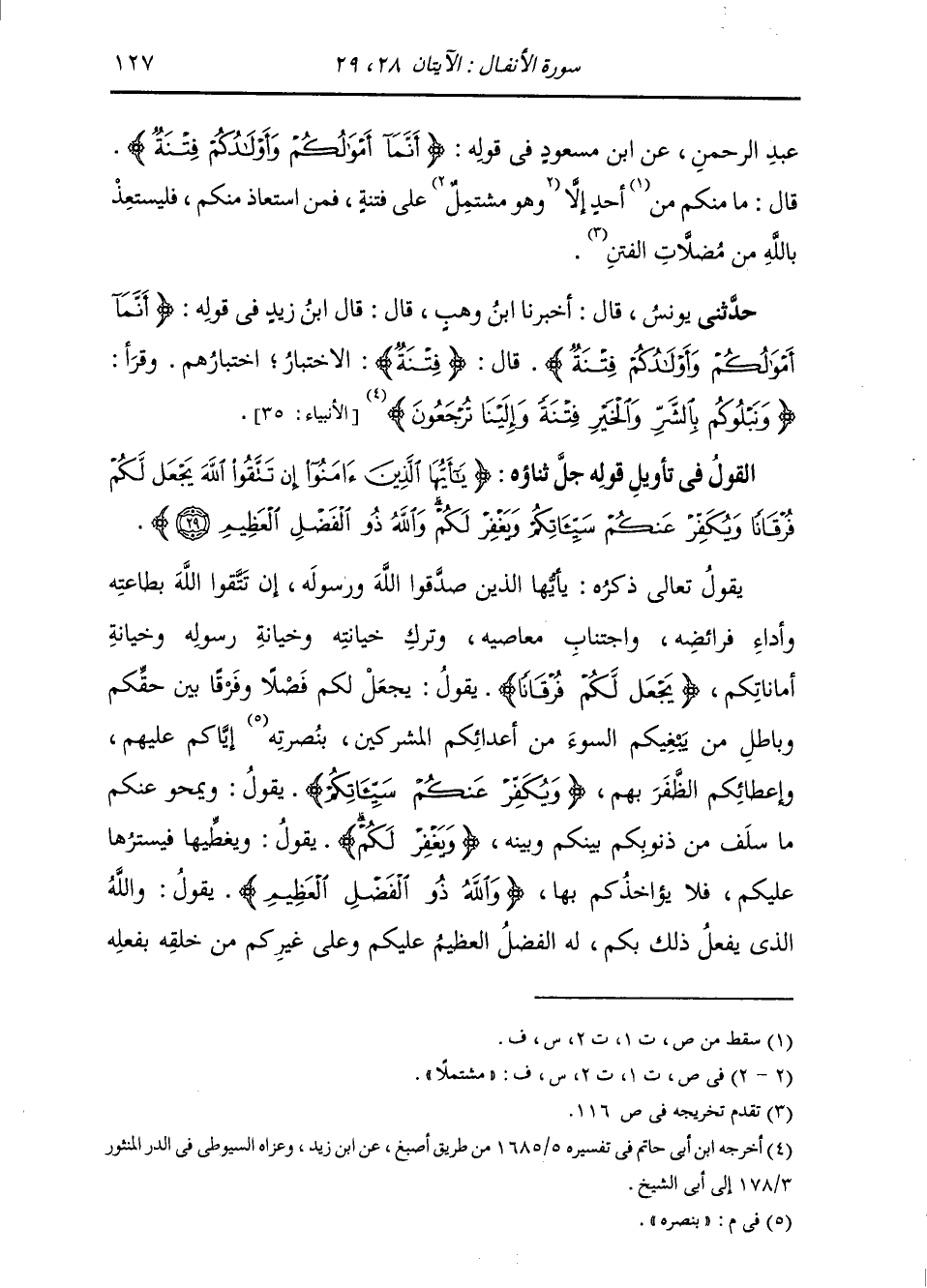§الْقَوْلُ فِي تَأْوِيلِ قَوْلِهِ تَعَالَى: {يَا أَيُّهَا الَّذِينَ آمَنُوا إِنْ تَتَّقُوا اللَّهَ يَجْعَلْ لَكُمْ فُرْقَانًا وَيُكَفِّرْ عَنكُمْ سَيِّئَاتِكُمْ وَيَغْفِرْ لَكُمْ وَاللهُ ذُو الْفَضْلِ الْعَظِيمِ} [الأنفال: 29] يَقُولُ تَعَالَى ذِكْرُهُ: {يَا أَيُّهَا الَّذِينَ آمَنُوا} [البقرة: 104] صَدَّقُوا اللَّهَ وَرَسُولَهُ {إِنْ تَتَّقُوا اللَّهَ} [الأنفال: 29] بِطَاعَتِهِ، وَأَدَاءِ فَرَائِضِهِ وَاجْتِنَابِ مَعَاصِيهِ، وَتَرْكِ خِيَانَتِهِ، خِيَانَةِ رَسُولِهِ وَخِيَانَةِ أَمَانَاتِكُمْ {يَجْعَلْ لَكُمْ فُرْقَانًا} [الأنفال: 29] يَقُولُ: يَجْعَلْ لَكُمْ فَصْلًا وَفَرْقًا بَيْنَ حَقِّكُمْ وَبَاطِلِ مَنْ يَبْغِيكُمُ السُّوءَ مِنْ أَعْدَائِكُمُ الْمُشْرِكِينَ بِنَصْرِهِ إِيَّاكُمْ عَلَيْهِمْ، وَإِعْطَائِكُمُ الظَّفَرَ بِهِمْ. {وَيُكَفِّرْ عَنْكُمْ سَيِّئَاتِكُمْ} [الأنفال: 29] يَقُولُ: وَيَمْحُو عَنْكُمْ مَا سَلَفَ مِنْ ذُنُوبِكُمْ بَيْنَكُمْ وَبَيْنَهُ. {ويغفر لكم} [آل عمران: 31] يَقُولُ: وَيُغَطِّيهَا، فَيَسْتُرُهَا عَلَيْكُمْ، فَلَا يُؤَاخِذُكُمْ بِهَا. {وَاللهُ ذُو الْفَضْلِ الْعَظِيمِ} [البقرة: 105] يَقُولُ: وَاللَّهُ الَّذِي يَفْعَلُ ذَلِكَ بِكُمْ، لَهُ الْفَضْلُ الْعَظِيمُ عَلَيْكُمْ وَعَلَى غَيْرِكُمْ مِنْ خَلْقِهِ بِفِعْلِهِ