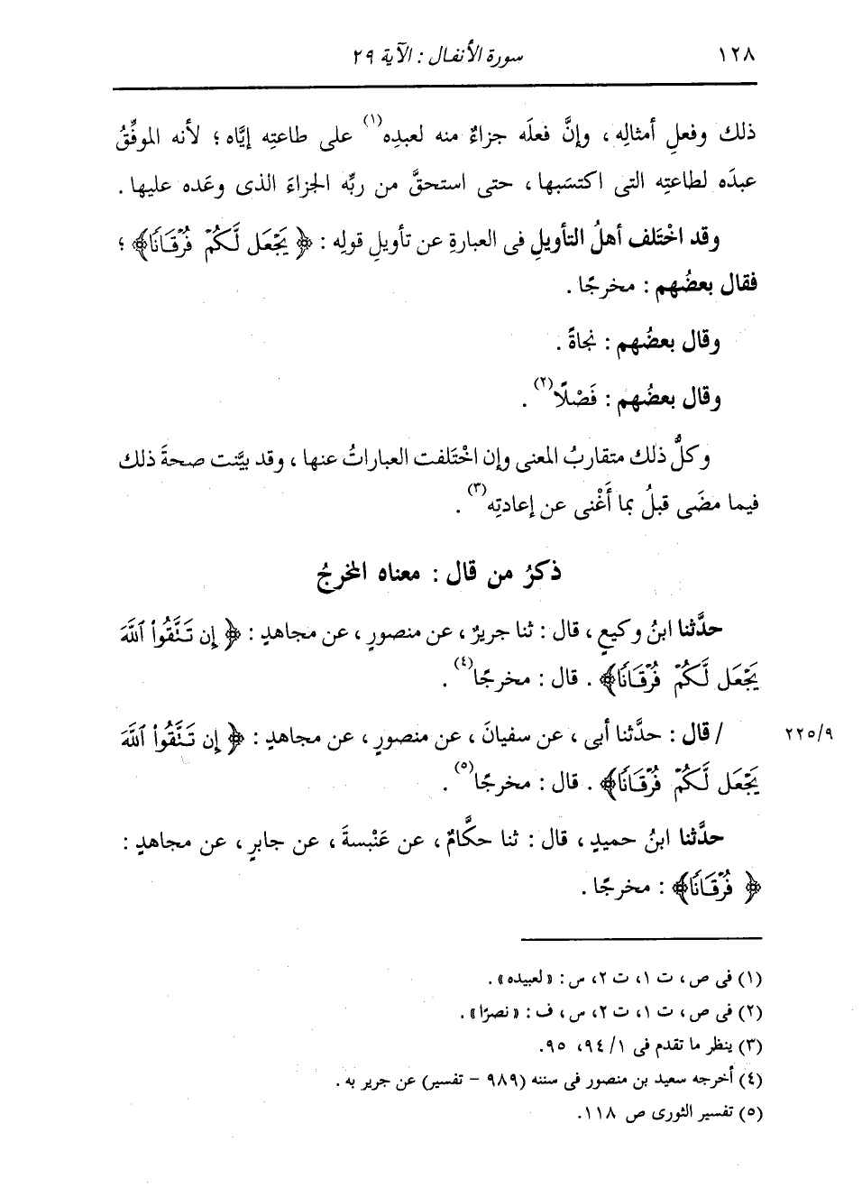 ذِكْرُ مَنْ قَالَ: مَعْنَاهُ الْمَخْرَجُ: حَدَّثَنَا ابْنُ وَكِيعٍ، قَالَ: ثنا جَرِيرٌ، عَنْ مَنْصُورٍ: عَنْ مُجَاهِدٍ: " {§إِنْ تَتَّقُوا اللَّهَ يَجْعَلْ لَكُمْ فُرْقَانًا} [الأنفال: 29] قَالَ: مَخْرَجًا "