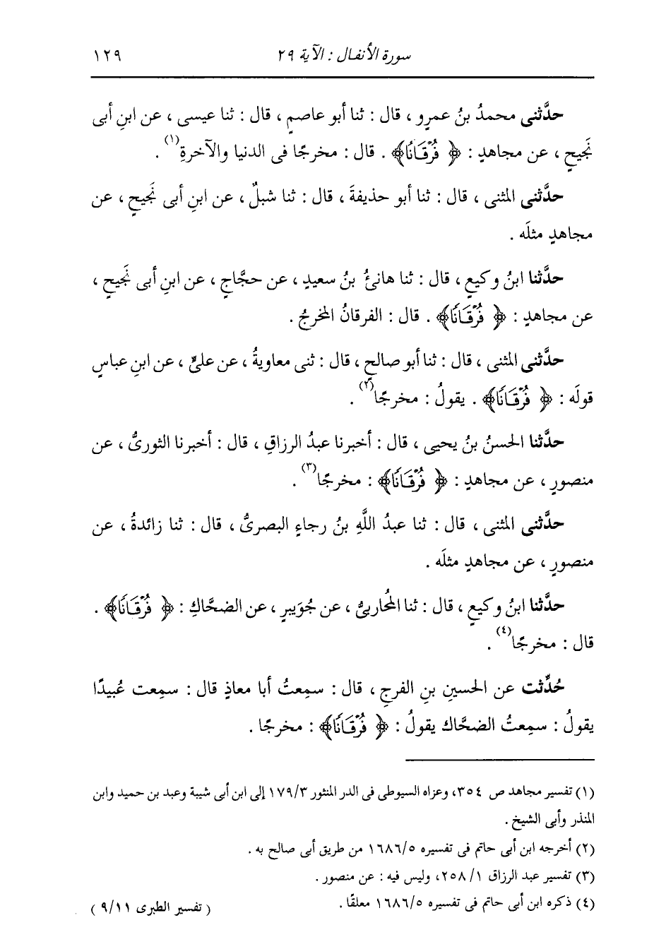 حُدِّثْتُ عَنِ الْحُسَيْنِ بْنِ الْفَرَجِ، قَالَ: سَمِعْتُ أَبَا مُعَاذٍ، قَالَ: سَمِعْتُ عَبِيدًا، يَقُولُ: سَمِعْتُ الضَّحَّاكَ، يَقُولُ: " {§فُرْقَانًا} [الأنفال: 29] مَخْرَجًا ". -[130]- حَدَّثَنَا أَحْمَدُ بْنُ إِسْحَاقَ، قَالَ: ثنا أَبُو أَحْمَدَ، قَالَ: ثنا سُفْيَانُ، عَنْ مَنْصُورٍ، عَنْ مُجَاهِدٍ، مِثْلَهُ