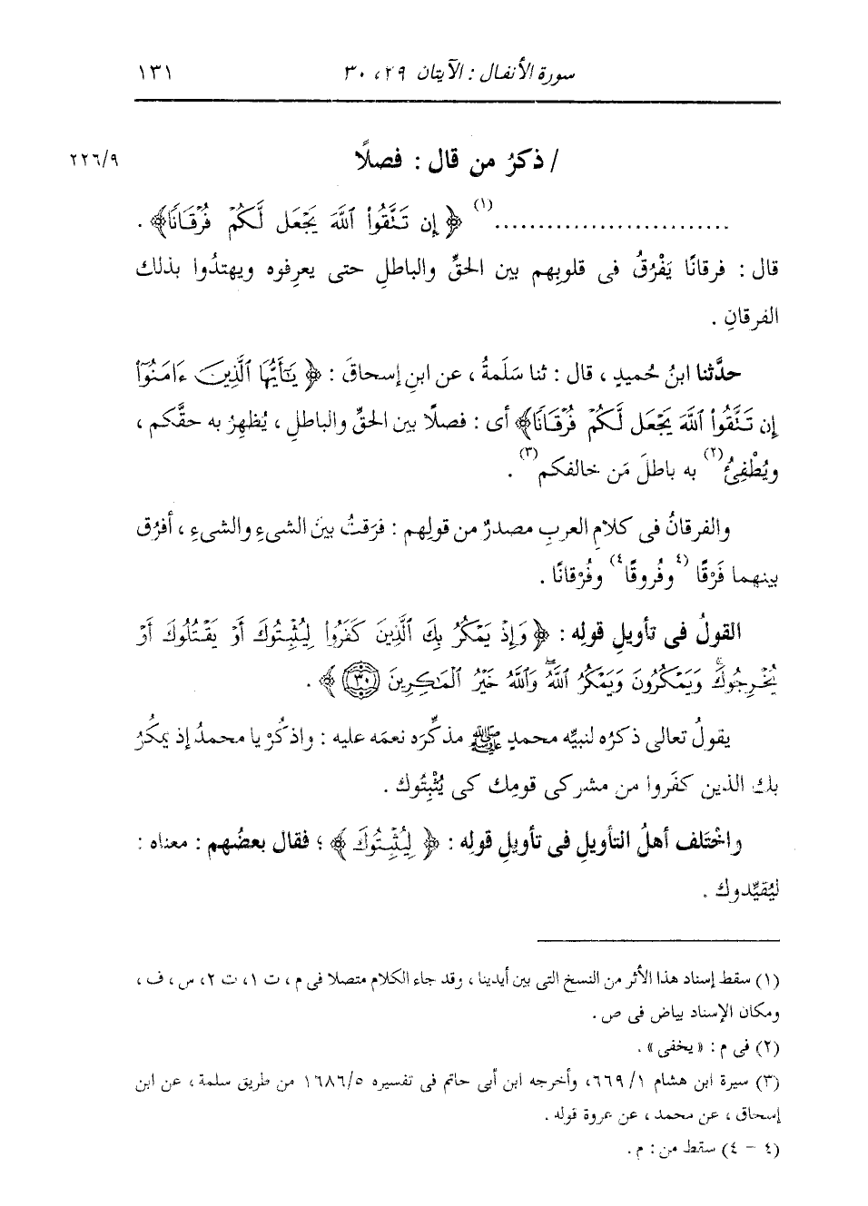 حَدَّثَنَا ابْنُ حُمَيْدٍ، قَالَ: ثنا سَلَمَةُ، عَنِ ابْنِ إِسْحَاقَ: " {يَا أَيُّهَا الَّذِينَ آمَنُوا §إِنْ تَتَّقُوا اللَّهَ يَجْعَلْ لَكُمْ فُرْقَانًا} [الأنفال: 29] أَيْ: فَصْلًا بَيْنَ الْحَقِّ الْبَاطِلِ، يُظْهِرُ بِهِ حَقَّكُمْ وَيُخْفِي بِهِ بَاطِلَ مَنْ خَالَفَكُمْ " وَالْفُرْقَانُ فِي كَلَامِ الْعَرَبِ مَصْدَرٌ، مِنْ قَوْلِهِمْ: فَرَّقْتُ بَيْنَ الشَّيْءِ وَالشَّيْءِ أُفَرِّقُ بَيْنَهُمَا فَرْقًا وَفُرْقَانًا