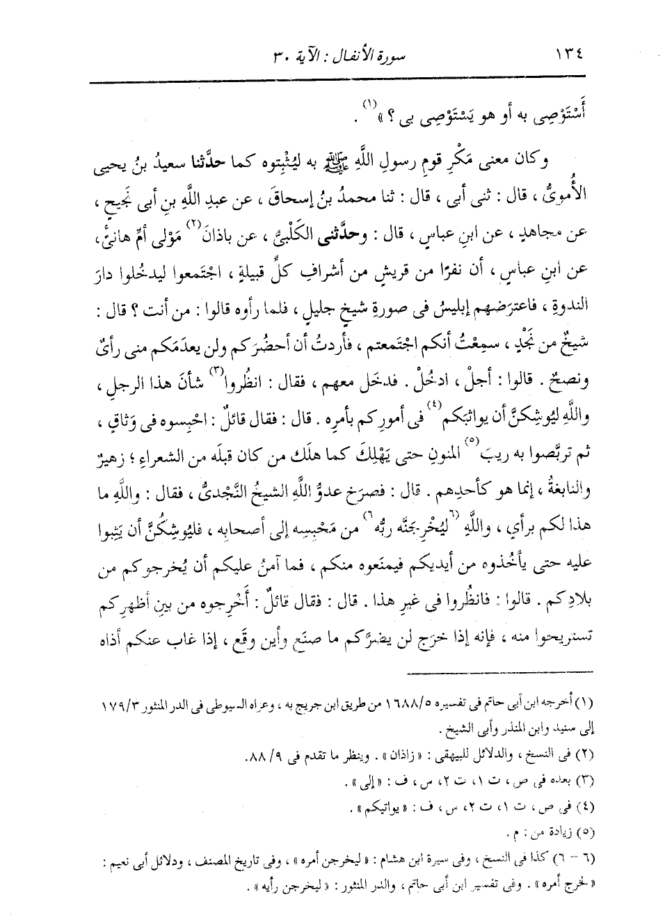 كَمَا: حَدَّثَنَا سَعِيدُ بْنُ يَحْيَى الْأُمَوِيُّ، قَالَ: ثني أَبِي قَالَ: ثنا مُحَمَّدُ بْنُ إِسْحَاقَ، عَنْ عَبْدِ اللَّهِ بْنِ أَبِي نَجِيحٍ، عَنْ مُجَاهِدٍ، عَنِ ابْنِ عَبَّاسٍ، قَالَ: وَحدثني الْكَلْبِيُّ، عَنْ زَاذَانَ، مَوْلَى أُمِّ هَانِئٍ، عَنِ ابْنِ عَبَّاسٍ: " أَنَّ §نَفَرًا، مِنْ قُرَيْشِ مِنْ أَشْرَافِ كُلِّ قَبِيلَةٍ اجْتَمَعُوا لِيَدْخُلُوا دَارَ النَّدْوَةِ، فَاعْتَرَضَهُمْ إِبْلِيسُ فِي صُورَةِ شَيْخٍ جَلِيلٍ، فَلَمَّا رَأَوْهُ قَالُوا: مَنْ أَنْتَ؟ قَالَ: شَيْخٌ مِنْ نَجْدٍ، سَمِعْتُ أَنَّكُمُ اجْتَمَعْتُمْ، فَأَرَدْتُ أَنْ أَحْضُرَكُمْ وَلَنْ يَعْدِمَكُمْ مِنِّي رَأْي وَنُصْحٌ. قَالُوا: أَجَلْ، ادْخُلْ، فَدَخَلَ مَعَهُمْ، فَقَالَ: انْظُرُوا فِي شَأْنِ هَذَا الرَّجُلِ، وَاللَّهِ لَيُوشِكَنَّ أَنْ يُوَاثِبَكُمْ فِي أُمُورِكُمْ بِأَمْرِهِ قَالَ: فَقَالَ قَائِلٌ: احْبِسُوهُ فِي وَثَاقٍ، ثُمَّ تَرَبَّصُوا بِهِ رَيْبَ الْمَنُونِ حَتَّى يَهْلِكَ كَمَا هَلَكَ مَنْ كَانَ قَبْلَهُ مِنَ الشُّعَرَاءِ، زُهَيْرٌ وَالنَّابِغَةُ، إِنَّمَا هُوَ كَأَحَدِهِمْ قَالَ: فَصَرَخَ عَدُوُّ اللَّهِ الشَّيْخُ النَّجْدِيُّ، فَقَالَ: وَاللَّهِ مَا هَذَا لَكُمْ رَأْي، وَاللَّهِ لَيُخْرِجَنَّهُ رَبُّهُ مِنْ مَحْبَسِهِ إِلَى أَصْحَابِهِ فَلَيُوشِكَنَّ أَنْ يَثِبُوا عَلَيْهِ حَتَّى يَأْخُذُوهُ مِنْ أَيْدِيكُمْ فَيَمْنَعُوهُ مِنْكُمْ، فَمَا آمَنُ عَلَيْكُمْ أَنْ يُخْرِجُوكُمْ مِنْ بِلَادِكُمْ، قَالُوا: فَانْظُرُوا فِي غَيْرِ هَذَا. قَالَ: فَقَالَ قَائِلٌ: أَخْرِجُوهُ مِنْ بَيْنِ أَظْهُرِكُمْ تَسْتَرِيحُوا مِنْهُ، فَإِنَّهُ إِذَا خَرَجَ لَنْ يَضُرَّكُمْ مَا صَنَعَ وَأَيْنَ وَقَعَ إِذَا غَابَ عَنْكُمْ أَذَاهُ -[135]- وَاسْتَرَحْتُمْ وَكَانَ أَمْرُهُ فِي غَيْرِكُمْ، فَقَالَ الشَّيْخُ النَّجْدِيُّ: وَاللَّهِ مَا هَذَا لَكُمْ بِرَأْي، أَلَمْ تَرَوْا حَلَاوَةَ قَوْلِهِ وَطَلَاقَةَ لِسَانِهِ وَأَخْذَ الْقُلُوبِ مَا تَسْمَعُ مِنْ حَدِيثِهِ؟ وَاللَّهِ لَئِنْ فَعَلْتُمْ ثُمَّ اسْتَعْرَضَ الْعَرَبَ، لَتَجْتَمِعَنَّ عَلَيْكُمْ، ثُمَّ لَيَأْتِيَنَّ إِلَيْكُمْ حَتَّى يُخْرِجَكُمْ مِنْ بِلَادِكُمْ وَيَقْتُلَ أَشْرَافَكُمْ، قَالُوا: صَدَقَ وَاللَّهِ، فَانْظُرُوا رَأَيًا غَيْرَ هَذَا قَالَ: فَقَالَ أَبُو جَهْلٍ: وَاللَّهِ لَأَشِيرَنَّ عَلَيْكُمْ بِرَأْي مَا أَرَاكُمْ أَبْصَرْتُمُوهُ بَعْدُ مَا أَرَى غَيْرَهُ. قَالُوا: وَمَا هُوَ؟ قَالَ: نَأْخُذُ مِنْ كُلِّ قَبِيلَةٍ غُلَامًا وَسَطًا شَابًّا نَهْدًا، ثُمَّ يُعْطَى كُلُّ غُلَامٍ مِنْهُمْ سَيْفًا صَارِمًا، ثُمَّ يَضْرِبُونَهُ ضَرْبَةَ رَجُلٍ وَاحِدٍ، فَإِذَا قَتَلُوهُ تَفَرَّقَ دَمُهُ فِي الْقَبَائِلِ كُلِّهَا، فَلَا أَظُنُّ هَذَا الْحَيَّ مِنْ بَنِي هَاشِمٍ يَقْدِرُونَ عَلَى حَرْبِ قُرَيْشٍ كُلِّهَا، فَإِنَّهُمْ إِذَا رَأَوْا ذَلِكَ قَبِلُوا الْعَقْلَ وَاسْتَرَحْنَا وَقَطَعنا عنا أَذَاهُ. فَقَالَ الشَّيْخُ النَّجْدِيُّ: هَذَا وَاللَّهِ الرَّأْي الْقَوْلُ مَا قَالَ الْفَتَى، لَا أَرَى غَيْرَهُ. قَالَ: فَتَفَرَّقُوا عَلَى ذَلِكَ وَهُمْ مُجْمِعُونَ لَهُ. قَالَ: فَأَتَى جِبْرِيلُ النَّبِيَّ صَلَّى اللهُ عَلَيْهِ وَسَلَّمَ فَأَمَرَهُ أَنْ لَا يَبِيتَ فِي مَضْجَعِهِ الَّذِي كَانَ يَبِيتُ فِيهِ تِلْكَ اللَّيْلَةَ، وَأَذِنَ اللَّهُ لَهُ عندَ ذَلِكَ بِالْخُرُوجِ، وَأَنْزَلَ عَلَيْهِ بَعْدَ قُدُومِهِ الْمَدِينَةَ الْأَنْفَالَ يُذَكِّرُهُ نِعَمَهُ عَلَيْهِ وَبَلَاءَهُ عندَهُ: {وَإِذْ يَمْكُرُ بِكَ الَّذِينَ كَفَرُوا لِيُثْبِتُوكَ أَوْ يَقْتُلُوكَ أَوْ يُخْرِجُوكَ وَيَمْكُرُونَ وَيَمْكُرُ اللَّهُ وَاللَّهُ خَيْرُ الْمَاكِرِينَ} [الأنفال: 30] ؛ وَأ