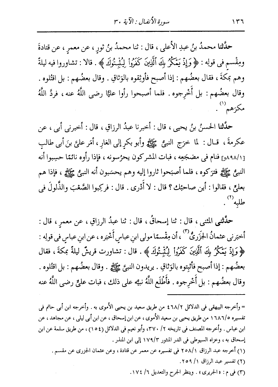 حَدَّثَنِي الْمُثَنَّى، قَالَ: ثنا إِسْحَاقُ، قَالَ: ثنا عَبْدُ الرَّزَّاقِ، عَنْ مَعْمَرٍ، قَالَ: أَخْبَرَنِي عُثْمَانُ الْجُرَيْرِيُّ: أَنَّ مِقْسَمًا، مَوْلَى ابْنِ عَبَّاسٍ أَخْبَرَهُ عَنِ ابْنِ عَبَّاسٍ، فِي قَوْلِهِ: " {§وَإِذْ يَمْكُرُ بِكَ الَّذِينَ كَفَرُوا لِيُثْبِتُوكَ} [الأنفال: 30] قَالَ: تَشَاوَرَتْ قُرَيْشٌ لَيْلَةً بِمَكَّةَ، فَقَالَ بَعْضُهُمْ: إِذَا أَصْبَحَ فَأَثْبِتُوهُ بِالْوَثَاقِ، يُرِيدُونَ النَّبِيَّ صَلَّى اللهُ عَلَيْهِ وَسَلَّمَ وَقَالَ بَعْضُهُمْ: بَلِ اقْتُلُوهُ، وَقَالَ بَعْضُهُمْ: بَلْ أَخْرِجُوهُ، فَأَطْلَعَ اللَّهُ نَبِيَّهُ عَلَى ذَلِكَ، فَبَاتَ عَلِيٌّ رَضِيَ اللَّهُ عَنْهُ -[137]- عَلَى فِرَاشِ النَّبِيِّ صَلَّى اللهُ عَلَيْهِ وَسَلَّمَ تِلْكَ اللَّيْلَةَ، وَخَرَجَ النَّبِيُّ صَلَّى اللهُ عَلَيْهِ وَسَلَّمَ حَتَّى لَحِقَ بِالْغَارِ، وَبَاتَ الْمُشْرِكُونَ يَحْرُسُونَ عَلِيًّا، يَحْسَبُونَ أَنَّهُ النَّبِيُّ صَلَّى اللهُ عَلَيْهِ وَسَلَّمَ. فَلَمَّا أَصْبَحُوا ثَارُوا إِلَيْهِ، فَلَمَّا رَأَوْهُ عَلِيًّا رَضِيَ اللَّهُ عَنْهُ، رَدَّ اللَّهُ مَكْرَهُمْ، فَقَالُوا: أَيْنَ صَاحِبُكَ؟ قَالَ: لَا أَدْرِي. فَاقْتَصُّوا أَثَرَهُ، فَلَمَّا بَلَغُوا الْجَبَلَ وَمَرُّوا بِالْغَارِ، رَأَوْا عَلَى بَابِهِ نَسْجَ الْعنكَبُوتِ، قَالُوا: لَوْ دَخَلَ هَاهُنَا لَمْ يَكُنْ نَسْجٌ عَلَى بَابِهِ، فَمَكَثَ فِيهِ ثَلَاثًا "