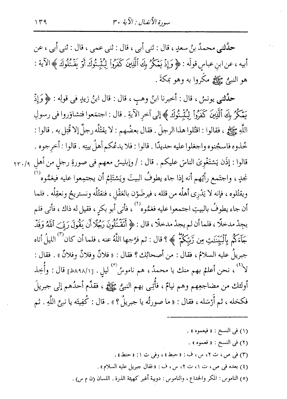 حَدَّثَنِي يُونُسُ، قَالَ: أَخْبَرَنَا ابْنُ وَهْبٍ، قَالَ: قَالَ ابْنُ زَيْدٍ، فِي قَوْلِهِ: " {§وَإِذْ يَمْكُرُ بِكَ الَّذِينَ كَفَرُوا لِيُثْبِتُوكَ} [الأنفال: 30] إِلَى آخِرِ الْآيَةِ قَالَ: اجْتَمَعُوا فَتَشَاوَرُوا فِي رَسُولِ اللَّهِ صَلَّى اللهُ عَلَيْهِ وَسَلَّمَ فَقَالُوا: اقْتُلُوا هَذَا الرَّجُلَ، فَقَالَ بَعْضُهُمْ: لَا يَقْتُلُهُ رَجُلٌ إِلَّا قُتِلَ بِهِ، قَالُوا: خُذُوهُ فْاسْجِنُوهُ وَاجْعَلُوا عَلَيْهِ حَدِيدًا، قَالُوا: فَلَا يَدَعُكُمْ أَهْلُ بَيْتِهِ. قَالُوا: أَخْرِجُوهُ، قَالُوا: إِذًا يَسْتَغْوِي النَّاسَ عَلَيْكُمْ. قَالَ: وَإِبْلِيسُ مَعَهُمْ فِي صُورَةِ رَجُلٍ مِنْ أَهْلِ نَجْدٍ. وَاجْتَمَعَ رَأْيُهُمْ أَنَّهُ إِذَا جَاءَ يَطُوفُ الْبَيْتَ وَيَسْتَسْلِمُ أَنْ يَجْتَمِعُوا عَلَيْهِ فَيَغُمُّوهُ وَيَقْتُلُوهُ، فَإِنَّهُ لَا يَدْرِي أَهْلُهُ مَنْ قَتَلَهُ، فَيَرْضُونَ بِالْعَقْلِ فَنَقْتُلُهُ وَنَسْتَرِيحُ وَنَعْقِلُهُ. فَلَمَّا أَنْ جَاءَ يَطُوفُ بِالْبَيْتِ اجْتَمَعُوا عَلَيْهِ، فَغَمَّوْهُ. فَأَتَى أَبُو بَكْرٍ، فَقِيلَ لَهُ ذَاكَ، فَأَتَى فَلَمْ يَجِدْ مَدْخَلًا؛ فَلَمَّا أَنْ لَمْ يَجِدْ مَدْخَلًا قَالَ: {أَتَقْتُلُونَ رَجُلًا أَنْ يَقُولَ رَبِّيَ اللَّهُ وَقَدْ جَاءَكُمْ بِالْبَيِّنَاتِ مِنْ رَبِّكُمْ} [غافر: 28] قَالَ: ثُمَّ فَرَّجَهَا اللَّهُ عَنْهُ؛ فَلَمَّا أَنْ كَانَ اللَّيْلُ أَتَاهُ جِبْرِيلُ عَلَيْهِ السَّلَامُ فَقَالَ: مَنْ أَصْحَابُكَ؟ فَقَالَ: فُلَانٌ وَفُلَانٌ وَفُلَانٌ. فَقَالَ: لَا نَحْنُ أَعْلَمُ بِهِمْ مِنْكَ يَا مُحَمَّدُ، هُوَ نَامُوسُ لَيْلٍ قَالَ: وَأُخِذَ أُولَئِكَ مِنْ مَضَاجِعِهِمْ وَهُمْ نِيَامٌ. فَأُتِيَ بِهِمُ النَّبِيَّ صَلَّى اللهُ عَلَيْهِ وَسَلَّمَ فَقُدِّمَ أَحَدُهُمْ إِلَى جِبْرِيلَ، فَكَحَلَهُ، ثُمَّ أَرْسَلَهُ، فَقَالَ: «مَا صُورَتُهُ يَا جِبْرِيلُ؟» قَالَ: كُفِيتَهُ يَا نَبِيَّ اللَّهِ. ثُمَّ