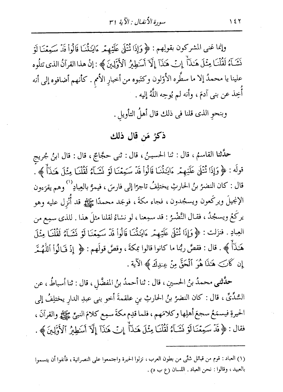 حَدَّثَنِي مُحَمَّدُ بْنُ الْحُسَيْنِ، قَالَ: ثنا أَحْمَدُ بْنُ الْمُفَضَّلِ، قَالَ: ثنا أَسْبَاطٌ، عَنِ السُّدِّيِّ، قَالَ: " §كَانَ النَّضْرُ بْنُ الْحَارِثِ بْنِ عَلْقَمَةَ أَخُو بَنِي عَبْدِ الدَّارِ يَخْتَلِفُ إِلَى الْحِيرَةِ، فَيَسْمَعُ سَجْعَ أَهْلِهَا وَكَلَامَهُمْ. فَلَمَّا قَدِمَ مَكَّةَ، سَمِعَ كَلَامَ النَّبِيِّ صَلَّى اللهُ عَلَيْهِ وَسَلَّمَ وَالْقُرْآنَ، فَقَالَ: {قَدْ سَمِعْنَا لَوْ نَشَاءُ لَقُلْنَا مِثْلَ هَذَا إِنْ هَذَا إِلَّا أَسَاطِيرُ الْأَوَّلِينَ} [الأنفال: 31]-[143]- يَقُولُ: أَسَاجِيعُ أَهْلِ الْحِيرَةِ "