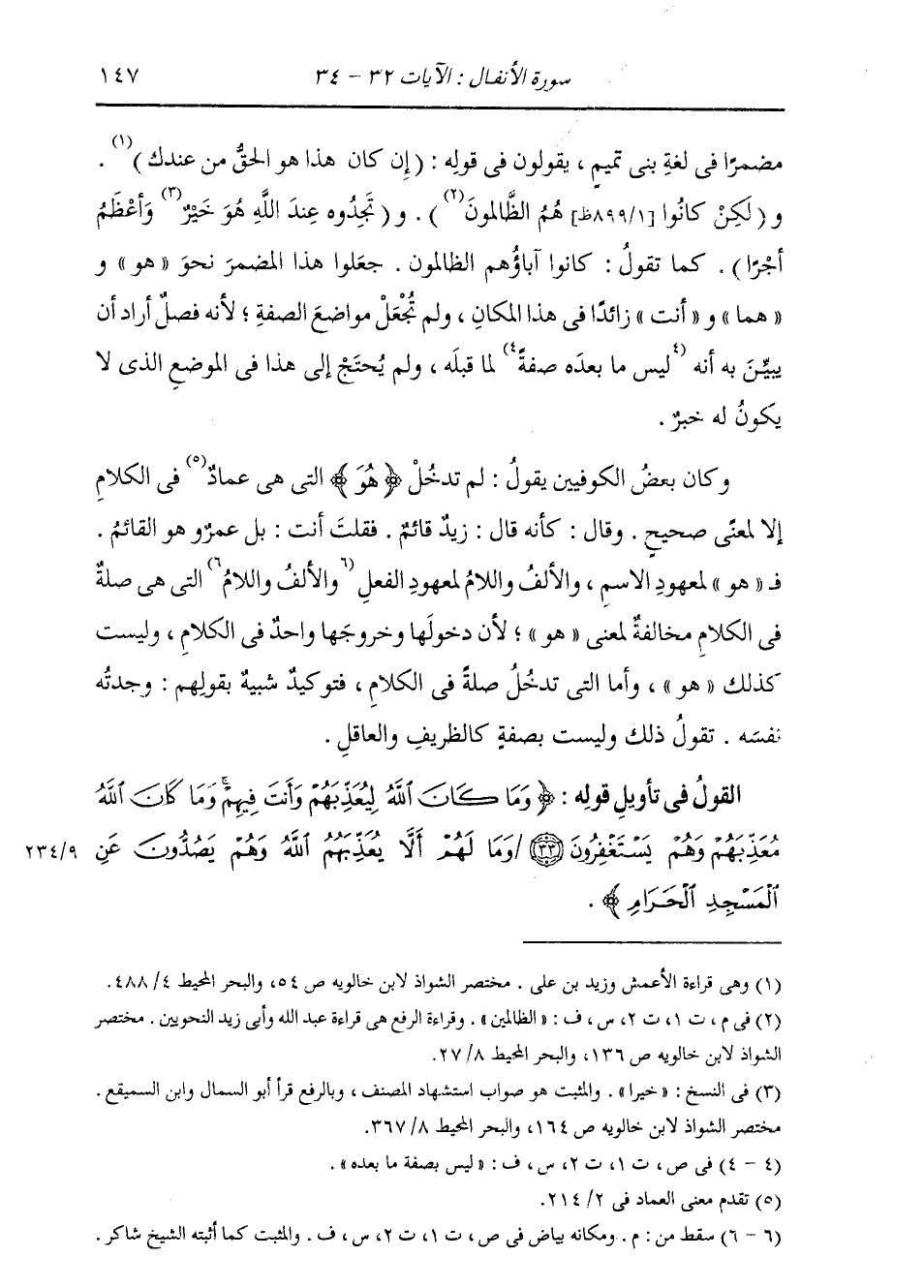 §الْقَوْلُ فِي تَأْوِيلِ قَوْلِهِ تَعَالَى: {وَمَا كَانَ اللَّهُ لِيُعَذِّبَهُمْ وَأَنْتَ فِيهِمْ وَمَا كَانَ اللَّهُ مُعَذِّبَهُمْ وَهُمْ يَسْتَغْفِرُونَ وَمَا لَهُمْ أَلَّا يُعَذِّبَهُمُ اللَّهُ وَهُمْ يَصُدُّونَ عَنِ الْمَسْجِدِ الْحَرَامِ وَمَا كَانُوا أَوْلِيَاءَهُ إِنْ أَوْلِيَاؤُهُ إِلَّا الْمُتَّقُونَ وَلَكِنَّ أَكْثَرَهُمْ لَا يَعْلَمُونَ} [الأنفال: 34]-[148]- اخْتَلَفَ أَهْلُ التَّأْوِيلِ فِي تَأْوِيلِ ذَلِكَ، فَقَالَ بَعْضُهُمْ: تَأْوِيلُهُ: {وَمَا كَانَ اللَّهُ لِيُعَذِّبَهُمْ وَأَنْتَ فِيهِمْ} [الأنفال: 33] أَيْ: وَأَنْتَ مُقِيمٌ بَيْنَ أَظْهُرِهِمْ. قَالَ: وَأُنْزِلَتْ هَذِهِ عَلَى النَّبِيِّ صَلَّى اللهُ عَلَيْهِ وَسَلَّمَ وَهُوَ مُقِيمٌ بِمَكَّةَ. قَالَ: ثُمَّ خَرَجَ النَّبِيُّ صَلَّى اللهُ عَلَيْهِ وَسَلَّمَ مِنْ بَيْنِ أَظْهُرِهِمْ، فَاسْتَغْفَرَ مَنْ بِهَا مِنَ الْمُسْلِمِينَ، فَأَنْزَلَ بَعْدَ خُرُوجِهِ عَلَيْهِ حِينَ اسْتَغْفَرَ أُولَئِكَ بِهَا: {وَمَا كَانَ اللَّهُ مُعَذِّبَهُمْ وَهُمْ يَسْتَغْفِرُونَ} [الأنفال: 33] قَالَ: ثُمَّ خَرَجَ أُولَئِكَ الْبَقِيَّةُ مِنَ الْمُسْلِمِينَ مِنْ بَيْنِهِمْ، فَعَذَّبَ الْكُفَّارَ
