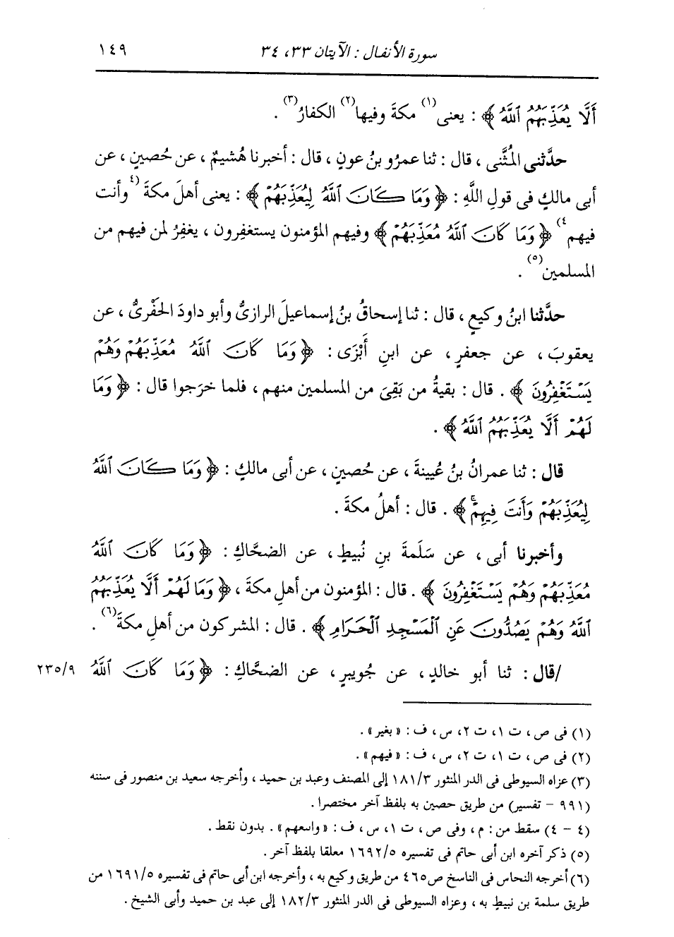 حَدَّثَنِي الْمُثَنَّى قَالَ: ثنا عَمْرُو بْنُ عَوْنٍ قَالَ: أَخْبَرَنَا هُشَيْمٌ، عَنْ حُصَيْنٍ، عَنْ أَبِي مَالِكٍ، فِي قَوْلِ اللَّهِ: " {§وَمَا كَانَ اللَّهُ لِيُعَذِّبَهُمْ} [الأنفال: 33] يَعْنِي: أَهْلَ مَكَّةَ. {وَمَا كَانَ اللَّهُ مُعَذِّبَهُمْ} [الأنفال: 33] وَفِيهِمُ الْمُؤْمِنُونَ، يَسْتَغْفِرُونَ؛ يَغْفِرُ لِمَنْ فِيهِمْ مِنَ الْمُسْلِمِينَ "