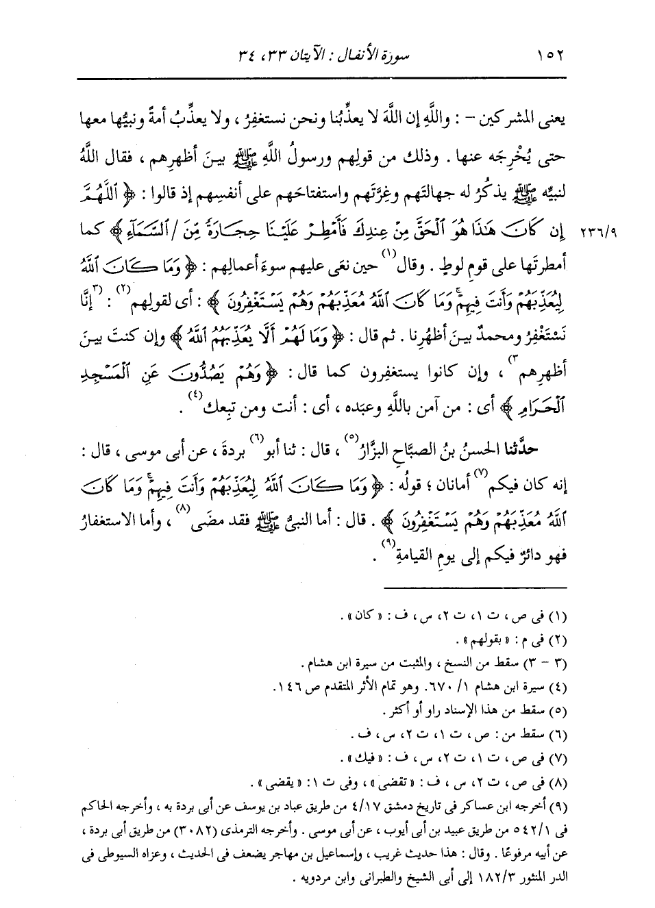 حَدَّثَنَا الْحَسَنُ بْنُ الصَّبَّاحِ الْبَزَّارُ، قَالَ: ثنا أَبُو بُرْدَةَ، عَنْ أَبِي مُوسَى، قَالَ: " إِنَّهُ كَانَ فِيكُمْ أَمَانَانِ: قَوْلُهُ: {§وَمَا كَانَ اللَّهُ لِيُعَذِّبَهُمْ وَأَنْتَ فِيهِمْ وَمَا كَانَ اللَّهُ مُعَذِّبَهُمْ وَهُمْ يَسْتَغْفِرُونَ} [الأنفال: 33] قَالَ: أَمَّا النَّبِيُّ صَلَّى اللهُ عَلَيْهِ وَسَلَّمَ فَقَدْ مَضَى، وَأَمَّا الِاسْتِغْفَارُ فَهُوَ دَائِرٌ فِيكُمْ إِلَى يَوْمِ الْقِيَامَةِ "