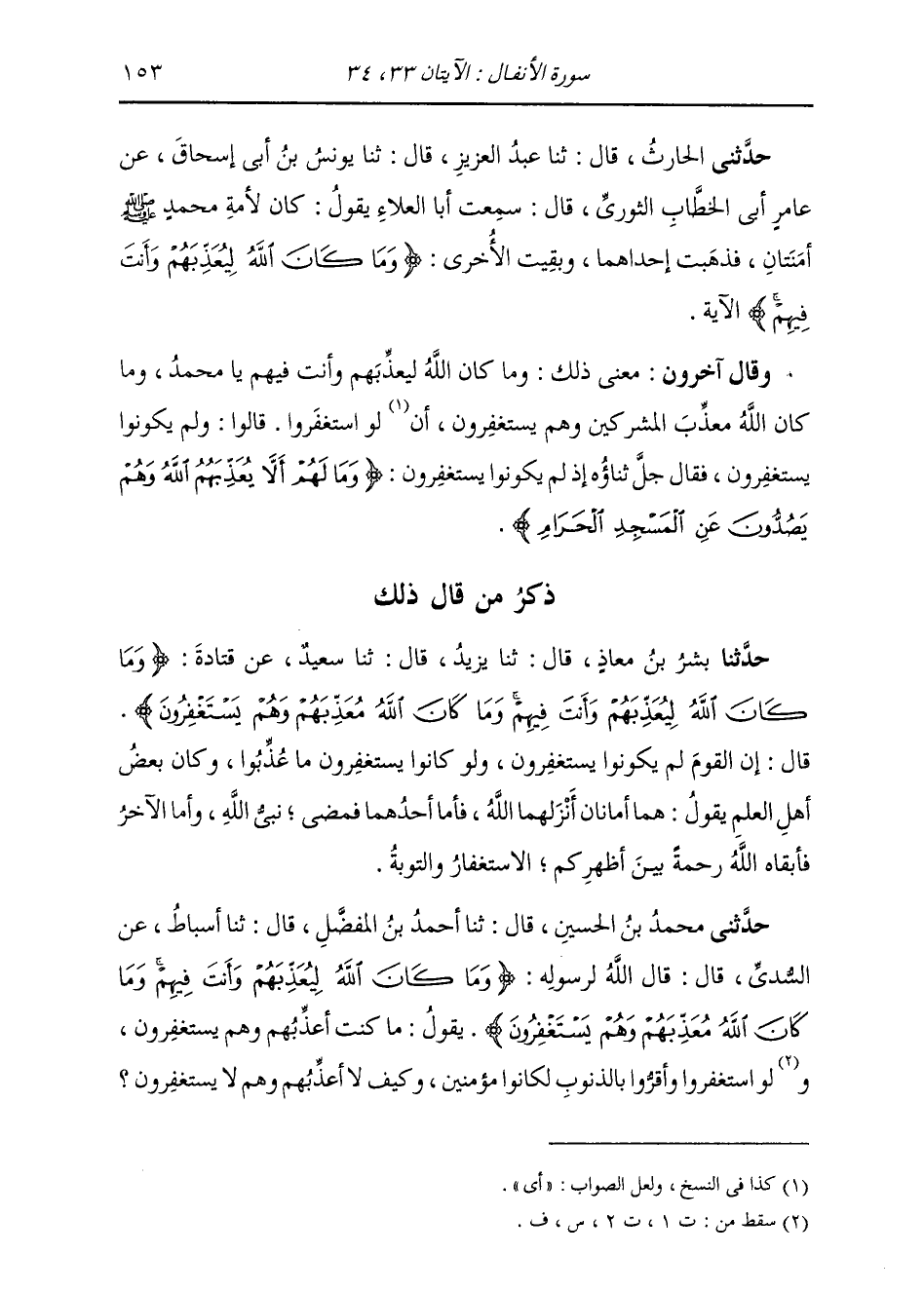 حَدَّثَنِي مُحَمَّدُ بْنُ الْحُسَيْنِ، قَالَ: ثنا أَحْمَدُ بْنُ الْمُفَضَّلِ، قَالَ: ثنا أَسْبَاطٌ، عَنِ السُّدِّيِّ، قَالَ: " قَالَ اللَّهُ لِرَسُولِهِ: {§وَمَا كَانَ اللَّهُ لِيُعَذِّبَهُمْ وَأَنْتَ فِيهِمْ وَمَا كَانَ اللَّهُ مُعَذِّبَهُمْ وَهُمْ يَسْتَغْفِرُونَ} [الأنفال: 33] يَقُولُ: مَا كُنْتُ أُعَذِّبُهُمْ وَهُمْ يَسْتَغْفِرُونَ، وَلَوِ اسْتَغْفَرُوا وَأَقَرُّوا بِالذُّنُوبِ لَكَانُوا مُؤْمِنِينَ، وَكَيْفَ لَا أُعَذِّبُهُمْ وَهُمْ لَا يَسْتَغْفِرُونَ، -[154]- وَمَا لَهُمْ أَلَّا يُعَذِّبَهُمُ اللَّهُ وَهُمْ يَصُدُّونَ عَنْ مُحَمَّدٍ وَعَنْ الْمَسْجِدِ الْحَرَامِ "