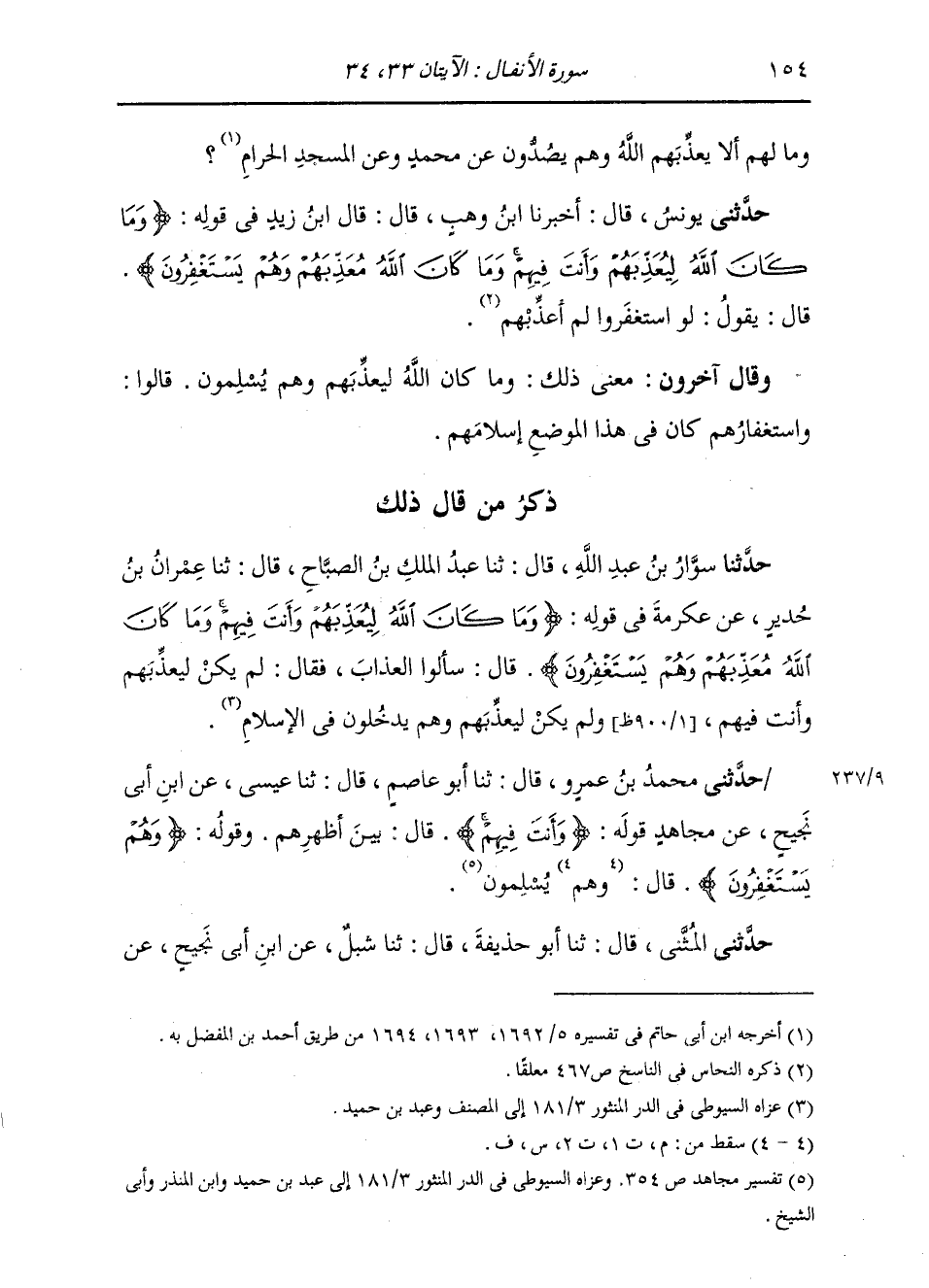 حَدَّثَنِي الْمُثَنَّى، قَالَ: ثنا أَبُو حُذَيْفَةَ، قَالَ: ثنا شِبْلٌ، عَنِ ابْنِ أَبِي نَجِيحٍ، عَنْ -[155]- مُجَاهِدٍ: " {§وَمَا كَانَ اللَّهُ لِيُعَذِّبَهُمْ وَأَنْتَ فِيهِمْ} [الأنفال: 33] بَيْنَ أَظْهُرِهِمْ {وَمَا كَانَ اللَّهُ مُعَذِّبَهُمْ وَهُمْ يَسْتَغْفِرُونَ} [الأنفال: 33] قَالَ: وَهُمْ يُسْلِمُونَ. {وَمَا لَهُمْ أَلَّا يُعَذِّبَهُمُ اللَّهُ وَهُمْ يَصُدُّونَ عَنِ الْمَسْجِدِ الْحَرَامِ} [الأنفال: 34] "