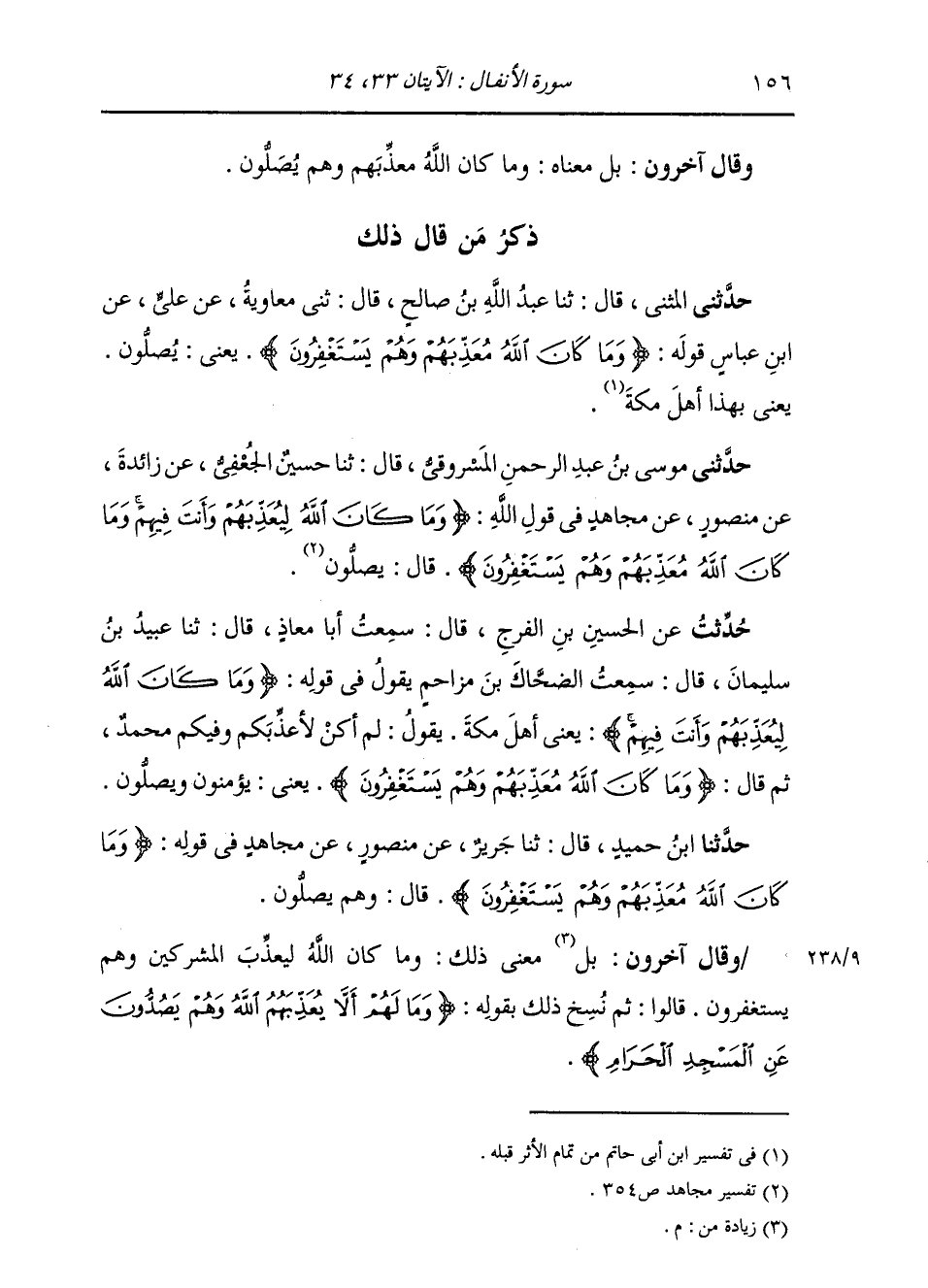 حَدَّثَنَا ابْنُ حُمَيْدٍ، قَالَ: ثنا جَرِيرٌ، عَنْ مَنْصُورٍ، عَنْ مُجَاهِدٍ، فِي قَوْلِهِ: " {§وَمَا كَانَ اللَّهُ مُعَذِّبَهُمْ وَهُمْ يَسْتَغْفِرُونَ} [الأنفال: 33] قَالَ: وَهُمْ يُصَلُّونَ " وَقَالَ آخَرُونَ: بَلْ مَعْنَى ذَلِكَ: وَمَا كَانَ اللَّهُ لَيُعَذِّبَ الْمُشْرِكِينَ وَهُمْ يَسْتَغْفِرُونَ. قَالُوا: ثُمَّ نُسِخَ ذَلِكَ بِقَوْلِهِ: {وَمَا لَهُمْ أَلَّا يُعَذِّبَهُمُ اللَّهُ وَهُمْ يَصُدُّونَ عَنِ الْمَسْجِدِ الْحَرَامِ} [الأنفال: 34]