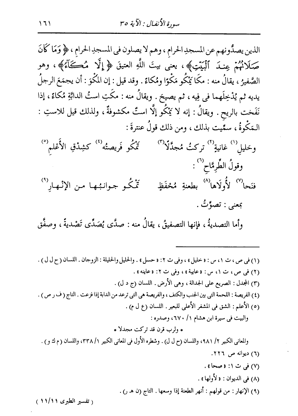 الَّذِينَ يَصُدُّونَهُمْ عَنِ الْمَسْجِدِ الْحَرَامِ وَهُمْ لَا يُصَلُّونَ فِي الْمَسْجِدِ الْحَرَامِ. {وَمَا كَانَ صَلَاتُهُمْ عِنْدَ الْبَيْتِ} [الأنفال: 35] يَعْنِي: بَيْتَ اللَّهِ الْعَتِيقَ {إِلَّا مُكَاءً} [الأنفال: 35] وَهُوَ الصَّفِيرُ، يُقَالُ مِنْهُ: مَكا يَمْكُو مَكْوًا وَمُكَاءً، وَقَدْ قِيلَ: إِنَّ الْمَكْوَ: أَنْ يَجْمَعَ الرَّجُلُ يَدَيْهِ ثُمَّ يُدْخِلَهُمَا فِي فِيهِ ثُمَّ يَصِيحَ، وَيُقَالُ مِنْهُ: مَكَتِ اسْتُ الدَّابَّةِ مُكَاءً: إِذَا نَفَخَتْ بِالرِّيحِ، وَيُقَالُ: إِنَّهُ لَا يَمْكُو إِلَّا اسْتٌ مَكْشُوفَةٌ، وَلِذَلِكَ قِيلَ لِلِاسْتِ الْمَكْوَةُ، سُمِّيَتْ بِذَلِكَ، وَمِنْ ذَلِكَ قَوْلُ عَنْتَرَةَ: