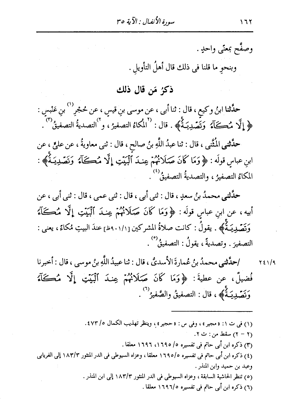 حَدَّثَنِي الْمُثَنَّى، قَالَ: ثنا عَبْدُ اللَّهِ بْنُ صَالِحٍ، قَالَ: ثني مُعَاوِيَةُ، عَنْ عَلِيٍّ، عَنِ ابْنِ عَبَّاسٍ: قَوْلُهُ: " {§وَمَا كَانَ صَلَاتُهُمْ عِنْدَ الْبَيْتِ إِلَّا مُكَاءً وَتَصْدِيَةً} [الأنفال: 35] الْمُكَاءُ: التَّصْفِيرُ، وَالتَّصْدِيَةُ: التَّصْفِيقُ "