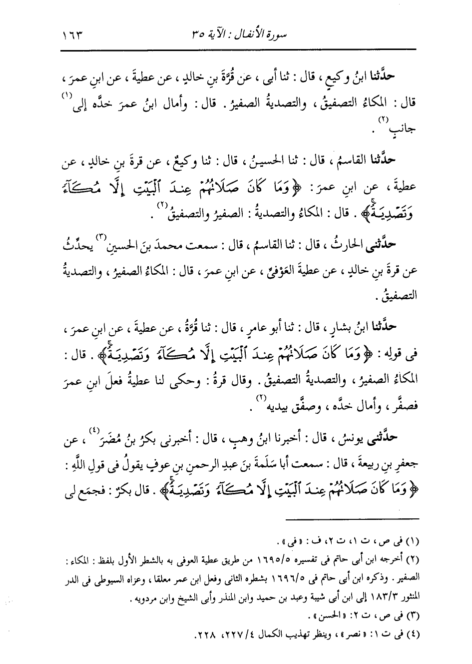 حَدَّثَنَا الْقَاسِمُ، قَالَ: ثنا الْحُسَيْنُ، قَالَ: ثنا وَكِيعٌ، عَنْ قُرَّةَ بْنِ خَالِدٍ، عَنْ عَطِيَّةَ، عَنِ ابْنِ عُمَرَ: " {§وَمَا كَانَ صَلَاتُهُمْ عِنْدَ الْبَيْتِ إِلَّا مُكَاءً وَتَصْدِيَةً} [الأنفال: 35] قَالَ: الْمُكَاءُ وَالتَّصْدِيَةُ: الصَّفِيرُ وَالتَّصْفِيقُ "