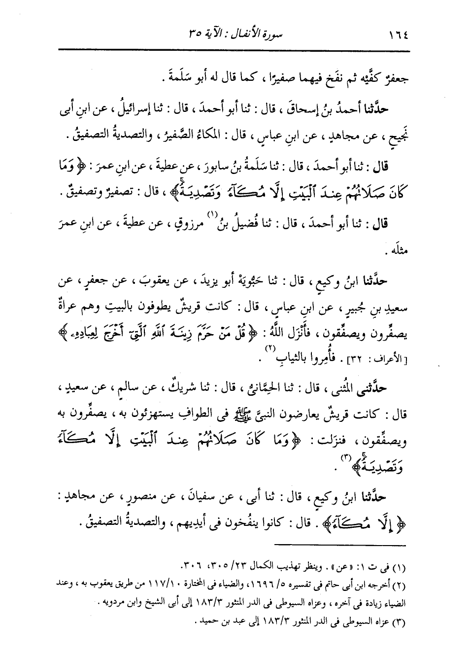 قَالَ: ثنا أَبُو أَحْمَدَ، قَالَ: ثنا سَلَمَةُ بْنُ سَابُورَ، عَنْ عَطِيَّةَ، عَنِ ابْنِ عُمَرَ: " {§وَمَا كَانَ صَلَاتُهُمْ عِنْدَ الْبَيْتِ إِلَّا مُكَاءً وَتَصْدِيَةً} [الأنفال: 35] قَالَ: تَصْفِيرٌ وَتَصْفِيقٌ ". قَالَ: ثنا أَبُو أَحْمَدَ، قَالَ: ثنا فُضَيْلُ بْنُ مَرْزُوقٍ، عَنْ عَطِيَّةَ، عَنِ ابْنِ عُمَرَ مِثْلَهُ