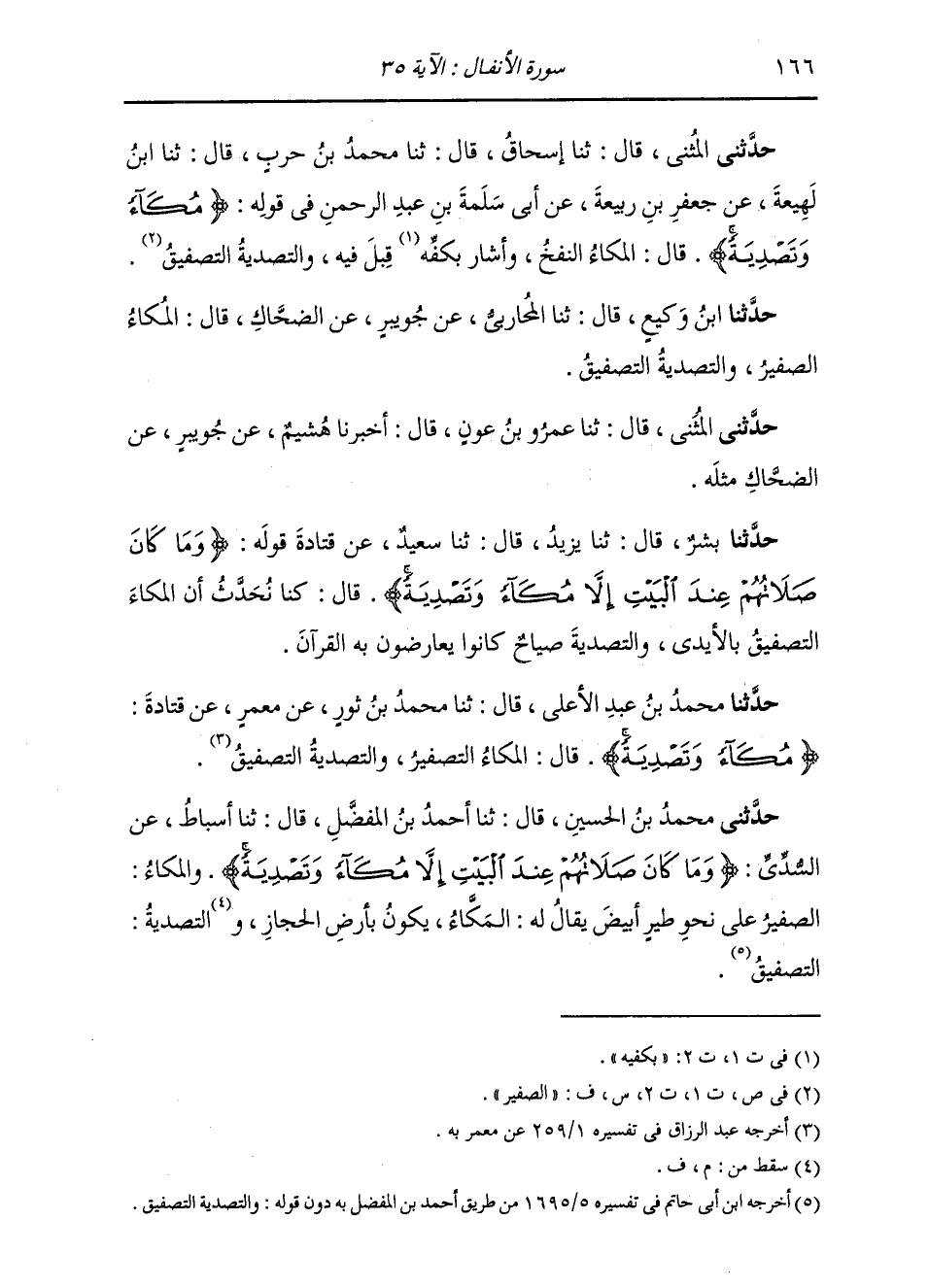 حَدَّثَنِي مُحَمَّدُ بْنُ الْحُسَيْنِ، قَالَ: ثنا أَحْمَدُ بْنُ الْمُفَضَّلِ، قَالَ: ثنا أَسْبَاطٌ، عَنِ السُّدِّيِّ: " {§وَمَا كَانَ صَلَاتُهُمْ عِنْدَ الْبَيْتِ إِلَّا مُكَاءً وَتَصْدِيَةً} [الأنفال: 35] وَالْمُكَاءُ: الصَّفِيرُ، عَلَى نَحْوِ طَيْرٍ أَبْيَضَ يُقَالُ لَهُ الْمُكَاءُ يَكُونُ بِأَرْضِ الْحِجَازِ وَالتَّصْدِيَةُ: التَّصْفِيقُ "