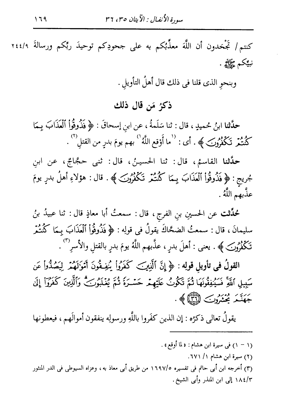ذِكْرُ مَنْ قَالَ ذَلِكَ: حَدَّثَنَا ابْنُ حُمَيْدٍ، قَالَ: ثنا سَلَمَةُ، عَنِ ابْنِ إِسْحَاقَ: " {§فَذُوقُوا الْعَذَابَ بِمَا كُنْتُمْ تَكْفُرُونَ} [آل عمران: 106] أَيْ مَا أَوْقَعَ اللَّهُ بِهِمْ يَوْمَ بَدْرٍ مِنَ الْقَتْلِ "