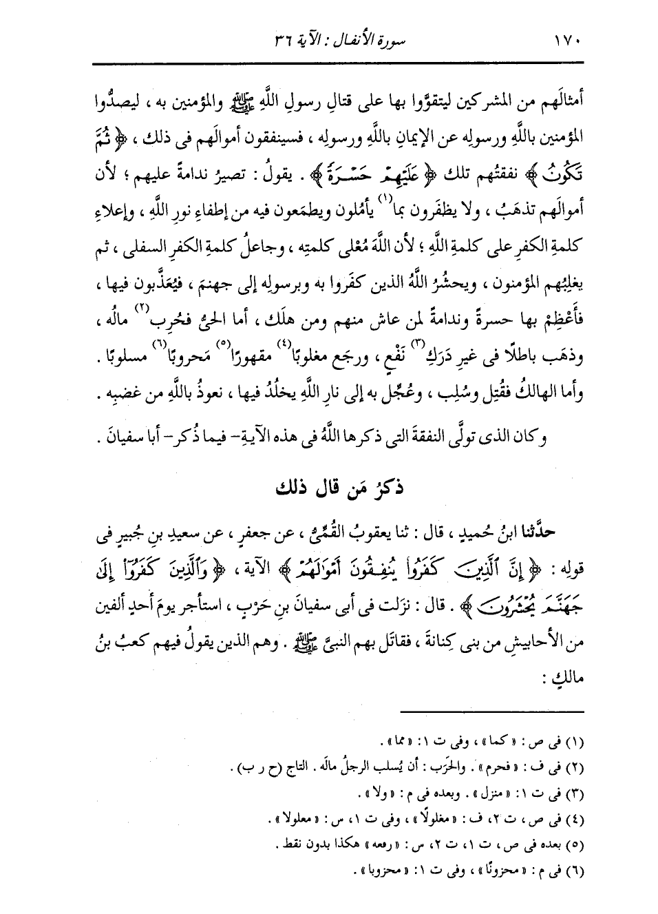 ذِكْرُ مَنْ قَالَ ذَلِكَ: حَدَّثَنَا ابْنُ حُمَيْدٍ، قَالَ: ثنا يَعْقُوبُ الْقُمِّيُّ، عَنْ جَعْفَرٍ، عَنْ سَعِيدِ بْنِ جُبَيْرٍ، فِي قَوْلِهِ: " {§إِنَّ الَّذِينَ كَفَرُوا يُنْفِقُونَ أَمْوَالَهُمْ} [الأنفال: 36] الْآيَةَ {وَالَّذِينَ كَفَرُوا إِلَى جَهَنَّمَ يُحْشَرُونَ} [الأنفال: 36] قَالَ: نَزَلَتْ فِي أَبِي سُفْيَانَ بْنِ حَرْبٍ اسْتَأْجَرَ يَوْمَ أُحُدٍ أَلْفَيْنِ مِنَ الْأَحَابِيشِ مِنْ بَنِي كِنَانَةَ، فَقَاتَلَ بِهِمُ النَّبِيَّ صَلَّى اللهُ عَلَيْهِ وَسَلَّمَ وَهُمُ الَّذِينَ يَقُولُ فِيهِمْ كَعْبُ بْنُ مَالِكٍ: