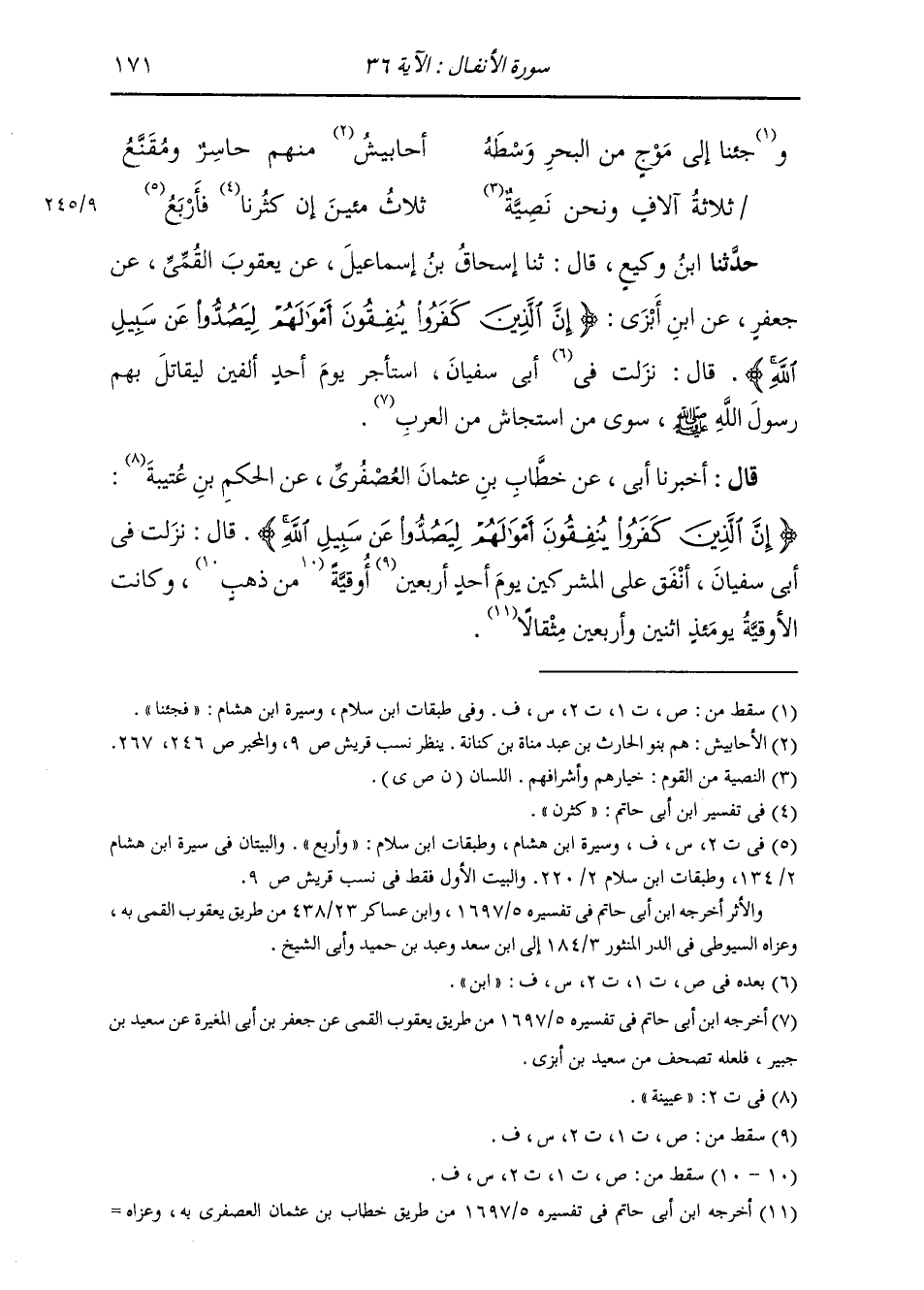 حَدَّثَنَا ابْنُ وَكِيعٍ، قَالَ: ثنا إِسْحَاقُ بْنُ إِسْمَاعِيلَ، عَنْ يَعْقُوبَ الْقُمِّيِّ، عَنْ جَعْفَرٍ، عَنِ ابْنِ أَبْزَى: " {§إِنَّ الَّذِينَ كَفَرُوا يُنْفِقُونَ أَمْوَالَهُمْ لِيَصُدُّوا عَنْ سَبِيلِ اللَّهِ} [سورة: الأنفال، آية رقم: 36] قَالَ: نَزَلَتْ فِي أَبِي سُفْيَانَ، اسْتَأْجَرَ يَوْمَ أُحُدٍ أَلْفَيْنِ لِيُقَاتِلَ بِهِمْ رَسُولَ اللَّهِ صَلَّى اللهُ عَلَيْهِ وَسَلَّمَ سِوَى مَنِ اسْتَجَاشَ مِنَ الْعَرَبِ "