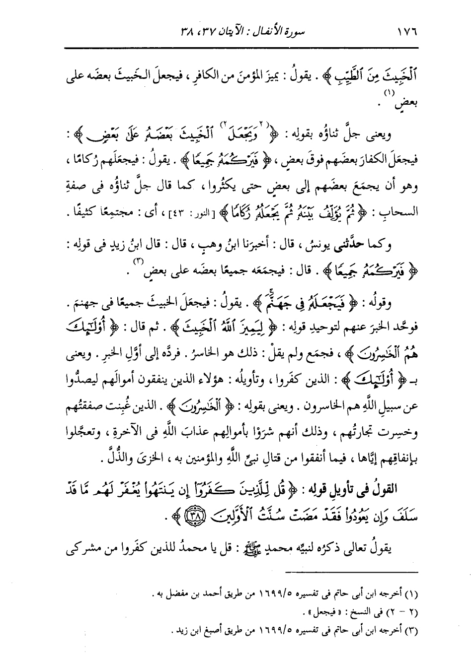 وَكَمَا: حَدَّثَنِي يُونُسُ، قَالَ: أَخْبَرَنَا ابْنُ وَهْبٍ، قَالَ: قَالَ ابْنُ زَيْدٍ، فِي قَوْلِهِ: " {§فَيَرْكُمَهُ جَمِيعًا} [الأنفال: 37] قَالَ: فَيَجْمَعُهُ جَمِيعًا بَعْضَهُ عَلَى بَعْضٍ " وَقَوْلُهُ: {فَيَجْعَلَهُ فِي جَهَنَّمَ} [الأنفال: 37] يَقُولُ: فَيُجْعَلُ الْخَبِيثَ جَمِيعًا فِي جَهَنَّمَ، فَوَحَّدَ الْخَبَرَ عَنْهُمْ لِتَوْحِيدِ قَوْلِهِ: {لِيَمِيزَ اللَّهُ الْخَبِيثَ} [الأنفال: 37] ثُمَّ قَالَ: {أُولَئِكَ هُمُ الْخَاسِرُونَ} [البقرة: 27] فَجَمَعَ وَلَمْ يَقُلْ: ذَلِكَ هُوَ الْخَاسِرُ، فَرَدَّهُ إِلَى أَوَّلِ الْخَبَرِ. وَيَعْنِي بِـ «أُولَئِكَ» الَّذِينَ كَفَرُوا، وَتَأْوِيلُهُ: هَؤُلَاءِ الَّذِينَ يُنْفِقُونَ أَمْوَالَهُمْ لِيَصُدُّوا عَنْ سَبِيلِ اللَّهِ هُمُ الْخَاسِرُونَ. وَيَعْنِي بِقَوْلِهِ: {الْخَاسِرُونَ} [الأنفال: 37] الَّذِينَ غُبِنَتْ صَفْقَتُهُمْ وَخَسِرَتْ تِجَارَتُهُمْ، وَذَلِكَ أَنَّهُمْ شَرَوْا بِأَمْوَالِهِمْ عَذَابَ اللَّهِ فِي الْآخِرَةِ، وَتَعَجَّلُوا بِإِنْفَاقِهِمْ إِيَّاهَا فِيمَا أَنْفَقُوا مِنْ قِتَالِ نَبِيِّ اللَّهِ وَالْمُؤْمِنِينَ بِهِ الْخِزْيَ وَالذُّلَّ
