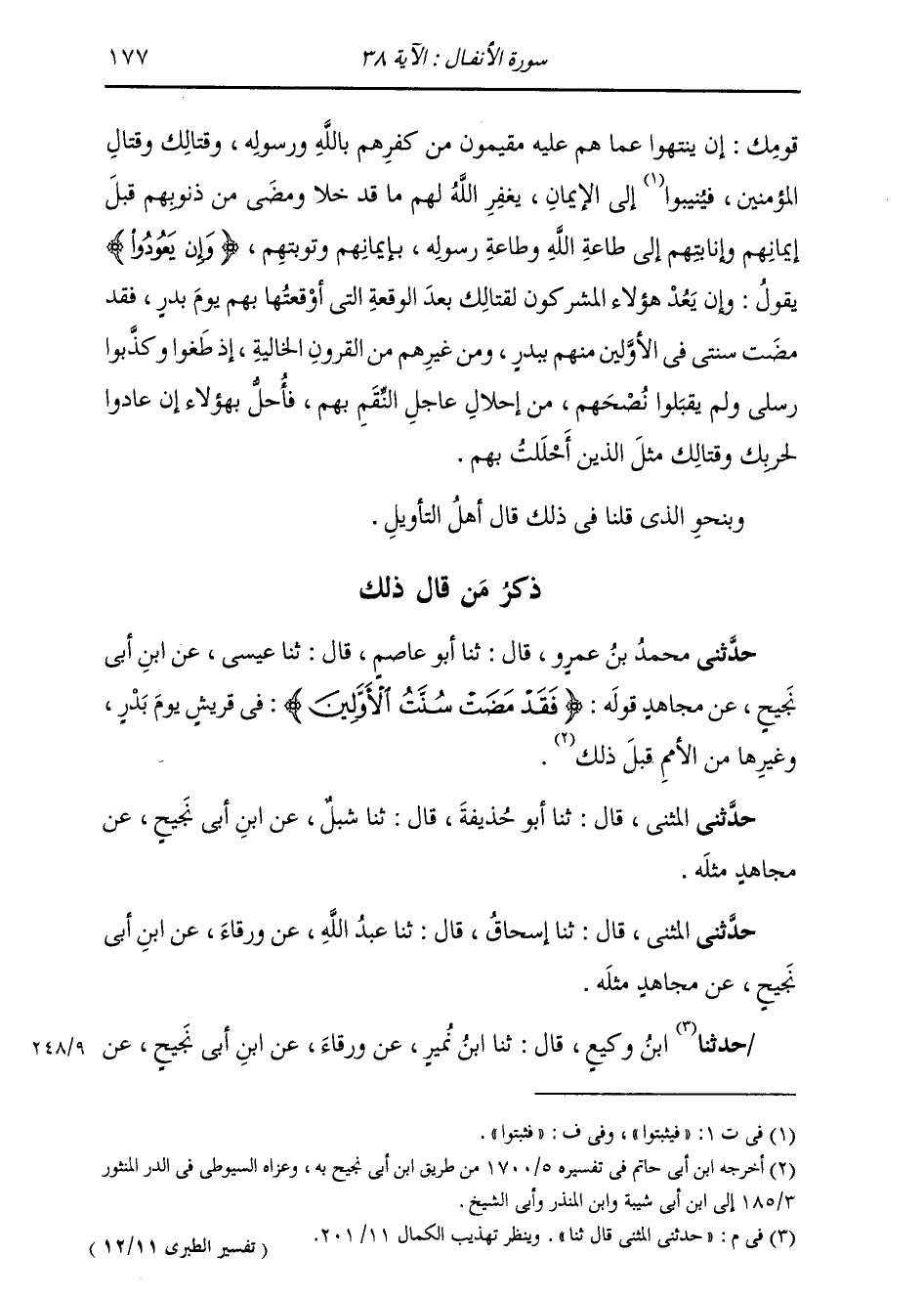 ذِكْرُ مَنْ قَالَ ذَلِكَ: حَدَّثَنِي مُحَمَّدُ بْنُ عَمْرٍو، قَالَ: ثنا أَبُو عَاصِمٍ، قَالَ: ثنا عِيسَى، عَنِ ابْنِ أَبِي نَجِيحٍ، عَنْ مُجَاهِدٍ، قَوْلُهُ: " {§فَقَدْ مَضَتْ سُنَّةُ الْأَوَّلِينَ} [الأنفال: 38] فِي قُرَيْشٍ يَوْمَ بَدْرٍ وَغَيْرِهَا مِنَ الْأُمَمِ قَبْلَ ذَلِكَ ". حَدَّثَنِي الْمُثَنَّى، قَالَ: ثنا أَبُو حُذَيْفَةَ، قَالَ: ثنا شِبْلٌ، عَنِ ابْنِ أَبِي نَجِيحٍ، عَنْ مُجَاهِدٍ مِثْلَهُ. حَدَّثَنِي الْمُثَنَّى، قَالَ: ثنا إِسْحَاقُ، قَالَ: ثنا عَبْدُ اللَّهِ، عَنْ وَرْقَاءَ، عَنِ ابْنِ أَبِي نَجِيحٍ، عَنْ مُجَاهِدٍ مِثْلَهُ