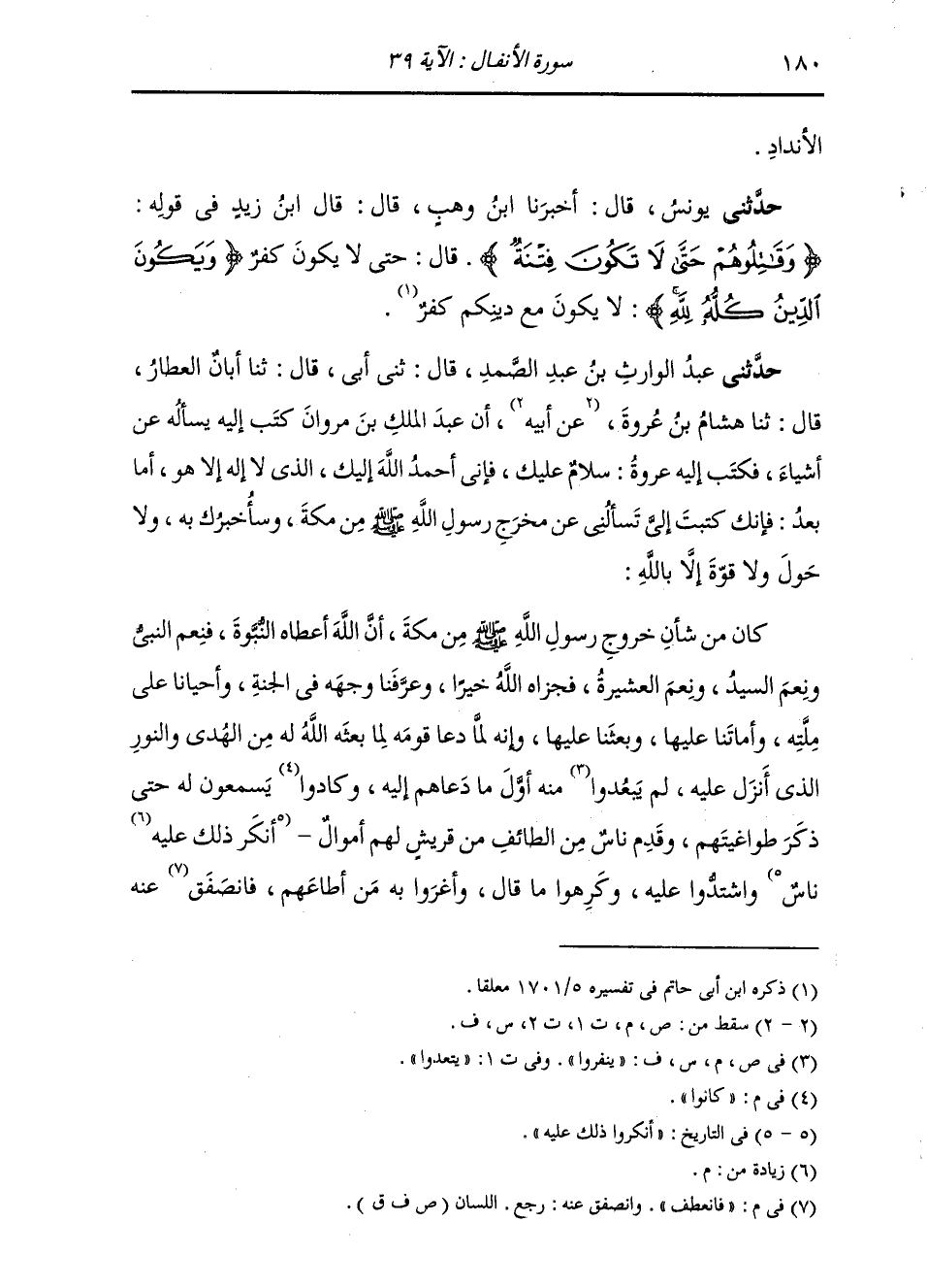 حَدَّثَنِي يُونُسُ، قَالَ: أَخْبَرَنَا ابْنُ وَهْبٍ، قَالَ: قَالَ ابْنُ زَيْدٍ، فِي قَوْلِهِ: " {§وَقَاتِلُوهُمْ حَتَّى لَا تَكُونَ فِتْنَةٌ} [البقرة: 193] قَالَ: حَتَّى لَا يَكُونَ كُفْرٌ {وَيَكُونَ الدِّينُ كُلُّهُ لِلَّهِ} [الأنفال: 39] لَا يَكُونُ مَعَ دِينِكُمْ كُفْرٌ "