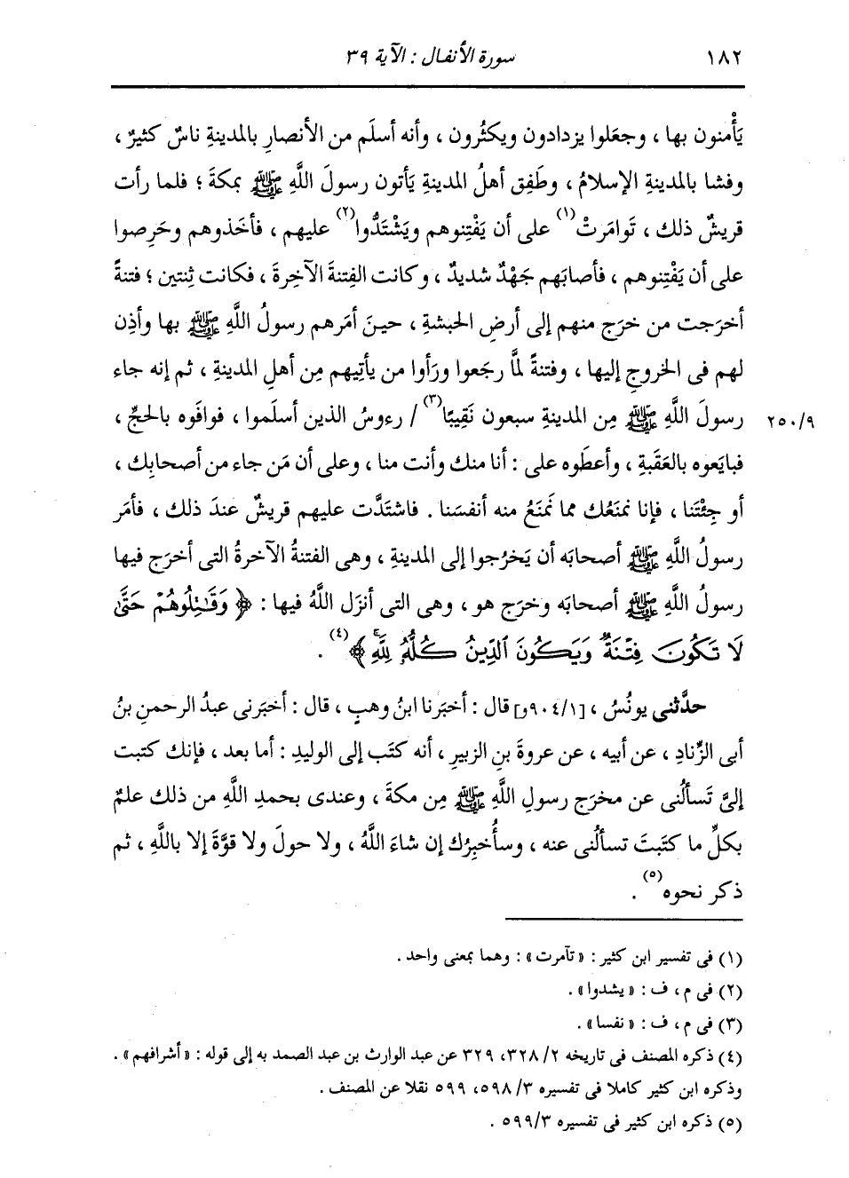 يَأْمَنُونَ بِهَا، وَجَعَلُوا يَزْدَادُونَ وَيَكْثُرُونَ. وَإِنَّهُ أَسْلَمَ مِنَ الْأَنْصَارِ بِالْمَدِينَةِ نَاسٌ كَثِيرٌ، وَفَشَا بِالْمَدِينَةِ الْإِسْلَامُ، وَطَفِقَ أَهْلُ الْمَدِينَةِ يَأْتُونَ رَسُولَ اللَّهِ صَلَّى اللهُ عَلَيْهِ وَسَلَّمَ بِمَكَّةَ، فَلَمَّا رَأَتْ قُرَيْشٌ ذَلِكَ، تَوَامَرَتْ عَلَى أَنْ يَفْتِنُوهُمْ، وَيَشُدُّوا عَلَيْهِمْ، فَأَخَذُوهُمْ وَحَرَصُوا عَلَى أَنْ يَفْتِنُوهُمْ، فَأَصَابَهُمْ جَهْدٌ شَدِيدٌ، وَكَانَتِ الْفِتْنَةُ الْآخِرَةُ، فَكَانَتْ ثِنْتَيْنِ: فِتْنَةً أَخْرَجَتْ مَنْ خَرَجَ مِنْهُمْ إِلَى أَرْضِ الْحَبَشَةِ حِينَ أَمَرَهُمْ رَسُولُ اللَّهِ صَلَّى اللهُ عَلَيْهِ وَسَلَّمَ بِهَا وَأَذِنَ لَهُمْ فِي الْخُرُوجِ إِلَيْهَا، وَفِتْنَةً لَمَّا رَجَعُوا وَرَأَوْا مَنْ يَأْتِيهِمْ مِنْ أَهْلِ الْمَدِينَةِ ثُمَّ إِنَّهُ جَاءَ رَسُولَ اللَّهِ صَلَّى اللهُ عَلَيْهِ وَسَلَّمَ مِنَ الْمَدِينَةِ سَبْعُونَ نَفْسًا رُءُوسُ الَّذِينَ أَسْلَمُوا، فَوَافَوْهُ بِالْحَجِّ، فَبَايَعُوهُ بِالْعَقَبَةِ، وَأَعْطَوْهُ عَلَى: إِنَّا مِنْكَ وَأَنْتَ مِنَّا، وَعَلَى: أَنَّ مَنْ جَاءَ مِنْ أَصْحَابِكَ أَوْ جِئْتَنَا فَإِنَّا نَمْنَعُكَ مِمَّا نَمْنَعُ مِنْهُ أَنْفُسَنَا. فَاشْتَدَّتْ عَلَيْهِمْ قُرَيْشٌ عِنْدَ ذَلِكَ، فَأَمَرَ رَسُولُ اللَّهِ صَلَّى اللهُ عَلَيْهِ وَسَلَّمَ أَصْحَابَهُ أَنْ يَخْرُجُوا إِلَى الْمَدِينَةِ، وَهِيَ الْفِتْنَةُ الْآخِرَةُ الَّتِي أَخْرَجَ فِيهَا رَسُولُ اللَّهِ صَلَّى اللهُ عَلَيْهِ وَسَلَّمَ أَصْحَابَهُ وَخَرَجَ هُوَ، وَهِيَ الَّتِي أَنْزَلَ اللَّهُ فِيهَا: {وَقَاتِلُوهُمْ حَتَّى لَا تَكُونَ فِتْنَةٌ وَيَكُونَ الدِّينُ كُلُّهُ لِلَّهِ} [الأنفال: 39] ". حَدَّثَنِي يُونُسُ، قَالَ: أَخْبَرَنَا ابْنُ وَهْبٍ، قَالَ: أَخْبَرَنِي عَبْدُ الرَّحْمَنِ بْنُ أَبِي الزِّنَادِ، عَنْ أَبِيهِ، عَنْ عُرْوَةَ بْنِ الزُّبَيْرِ، أَنَّهُ كَتَبَ إِلَى الْوَلِيدِ: أَمَّا بَعْدُ: فَإِنَّكُ كَتَبْتَ إِلَيَّ تَسْأَلُنِي عَنْ مَخْرَجِ رَسُولِ اللَّهِ صَلَّى اللهُ عَلَيْهِ وَسَلَّمَ مِنْ مَكَّةَ، وَعِنْدِي بِحَمْدِ اللَّهِ مِنْ ذَلِكَ عِلْمٌ بِكُلِّ مَا كَتَبْتَ تَسْأَلُنِي عَنْهُ، وَسَأُخْبِرُكَ إِنْ شَاءَ اللَّهُ، وَلَا حَوْلَ وَلَا قُوَّةَ إِلَّا بِاللَّهِ، ثُمَّ ذَكَرَ نَحْوَهُ