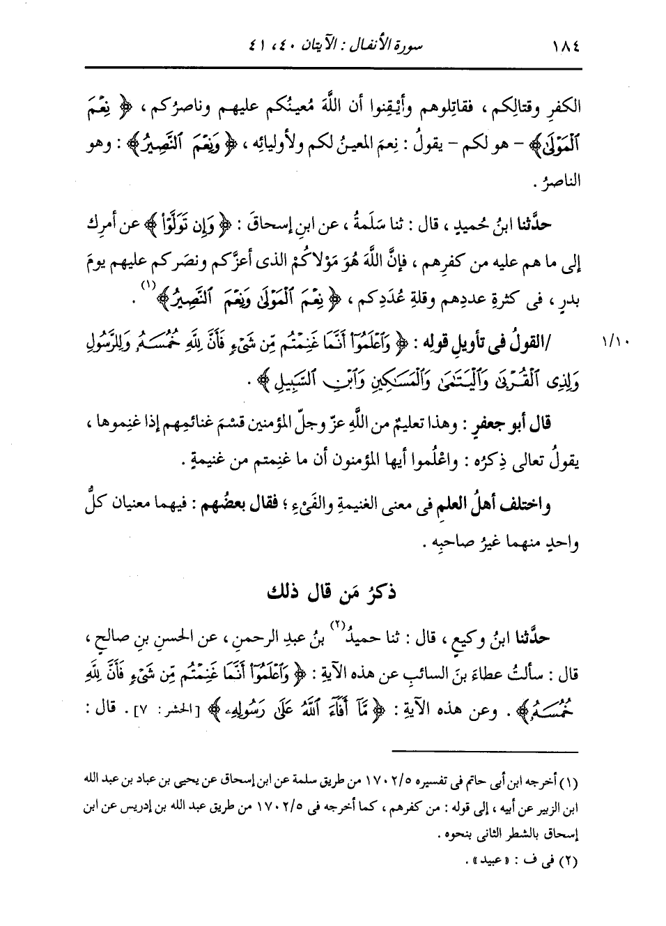 §الْقَوْلُ فِي تَأْوِيلِ قَوْلِهِ تَعَالَى: {وَاعْلَمُوا أَنَّمَا غَنِمْتُمْ مِنْ شَيْءٍ فَأَنَّ لِلَّهِ خُمُسَهُ وَلِلرَّسُولِ وَلِذِي الْقُرْبَى وَالْيَتَامَى وَالْمَسَاكِينِ وَابْنِ السَّبِيلِ} [الأنفال: 41] قَالَ أَبُو جَعْفَرٍ: وَهَذَا تَعْلِيمٌ مِنَ اللَّهِ عَزَّ وَجَلَّ الْمُؤْمِنِينَ قَسْمَ غَنَائِمِهِمْ إِذَا غَنِمُوهَا، يَقُولُ تَعَالَى ذِكْرُهُ: وَاعْلَمُوا أَيُّهَا الْمُؤْمِنُونَ أَنَّمَا غَنِمْتُمْ مِنْ غَنِيمَةٍ. وَاخْتَلَفَ أَهْلُ الْعِلْمِ فِي مَعْنَى الْغَنِيمَةِ وَالْفَيْءِ، فَقَالَ بَعْضُهُمْ: فِيهِمَا مَعْنَيَانِ كُلُّ وَاحِدٍ مِنْهُمَا غَيْرُ صَاحِبِهِ