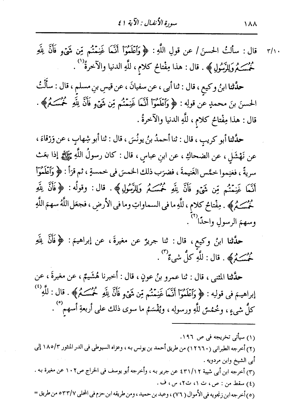 حَدَّثَنَا ابْنُ وَكِيعٍ، قَالَ: ثنا أَبِي، عَنْ سُفْيَانَ، عَنْ قَيْسِ بْنِ مُسْلِمٍ، قَالَ: سَأَلْتُ الْحَسَنَ بْنَ مُحَمَّدٍ، عَنْ قَوْلِهِ: " {§وَاعْلَمُوا أَنَّمَا غَنِمْتُمْ مِنْ شَيْءٍ فَأَنَّ لِلَّهِ خُمُسَهُ} [الأنفال: 41] قَالَ: هَذَا مِفْتَاحُ كَلَامٍ، لِلَّهِ الدُّنْيَا وَالْآخِرَةُ "
