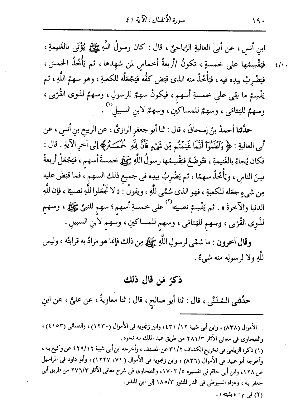 ذِكْرُ مَنْ قَالَ ذَلِكَ: حَدَّثَنِي الْمُثَنَّى، قَالَ: ثنا أَبُو صَالِحٍ، قَالَ: ثنا مُعَاوِيَةُ، عَنْ عَلِيٍّ، عَنِ ابْنِ -[191]- عَبَّاسٍ، قَالَ: «§كَانَتِ الْغَنِيمَةُ تُقْسَمُ عَلَى خَمْسَةِ أَخْمَاسٍ، فَأَرْبَعَةٌ مِنْهَا لِمَنْ قَاتَلَ عَلَيْهَا، وَخُمُسٌ وَاحِدٌ يُقْسَمُ عَلَى أَرْبَعٍ، فَرُبُعٌ لِلَّهِ وَالرَّسُولِ وَلِذِي الْقُرْبَى يَعْنِي قَرَابَةَ النَّبِيِّ صَلَّى اللهُ عَلَيْهِ وَسَلَّمَ فَمَا كَانَ لِلَّهِ وَالرَّسُولِ فَهُوَ لَقَرَابَةِ النَّبِيِّ صَلَّى اللهُ عَلَيْهِ وَسَلَّمَ، وَلَمْ يَأْخُذِ النَّبِيُّ صَلَّى اللهُ عَلَيْهِ وَسَلَّمَ، مِنَ الْخُمُسِ شَيْئًا، وَالرُّبُعُ الثَّانِي لِلْيَتَامَى، وَالرُّبُعُ الثَّالِثُ لِلْمَسَاكِينِ، وَالرُّبُعُ الرَّابِعُ لِابْنِ السَّبِيلِ» وَأَوْلَى الْأَقْوَالِ فِي ذَلِكَ بِالصَّوَابِ قَوْلُ مَنْ قَالَ قَوْلُهُ: {فَأَنَّ لِلَّهِ خُمُسَهُ} [الأنفال: 41] افْتِتَاحُ كَلَامٍ؛ وَذَلِكَ لِإِجْمَاعِ الْحُجَّةِ عَلَى أَنَّ الْخُمُسَ غَيْرُ جَائِزٍ قَسْمُهُ عَلَى سِتَّةِ أَسْهُمٍ، وَلَوْ كَانَ لِلَّهِ فِيهِ سَهْمٌ كَمَا قَالَ أَبُو الْعَالِيَةِ، لَوَجَبَ أَنْ يَكُونَ خُمُسُ الْغَنِيمَةِ مَقْسُومًا عَلَى سِتَّةِ أَسْهُمٍ. وَإِنَّمَا اخْتَلَفَ أَهْلُ الْعِلْمِ فِي قَسْمِهِ عَلَى خَمْسَةٍ فَمَا دُونَهَا، فَأَمَّا عَلَى أَكْثَرَ مِنْ ذَلِكَ فَمَا لَا نَعْلَمُ قَائِلًا قَالَهُ غَيْرَ الَّذِي ذَكَرْنَا مِنَ الْخَبَرِ عَنْ أَبِي الْعَالِيَةِ، وَفِي إِجْمَاعِ مَنْ ذَكَرْتُ الدَّلَالَةُ الْوَاضِحَةُ عَلَى صِحَّةِ مَا اخْتَرْنَا. فَأَمَّا مَنْ قَالَ: سَهْمُ الرَّسُولِ لِذَوِي الْقُرْبَى، فَقَدْ أَوْجَبَ لِلرَّسُولِ سَهْمًا، وَإِنْ كَانَ صَلَّى اللهُ عَلَيْهِ وَسَلَّمَ صَرَفَهُ إِلَى ذَوِي قَرَابَتِهِ، فَلَمْ يَخْرُجْ مِنْ أَنْ يَكُونَ الْقَسَمُ كَانَ عَلَى خَمْسَةِ أَسْهُمٍ