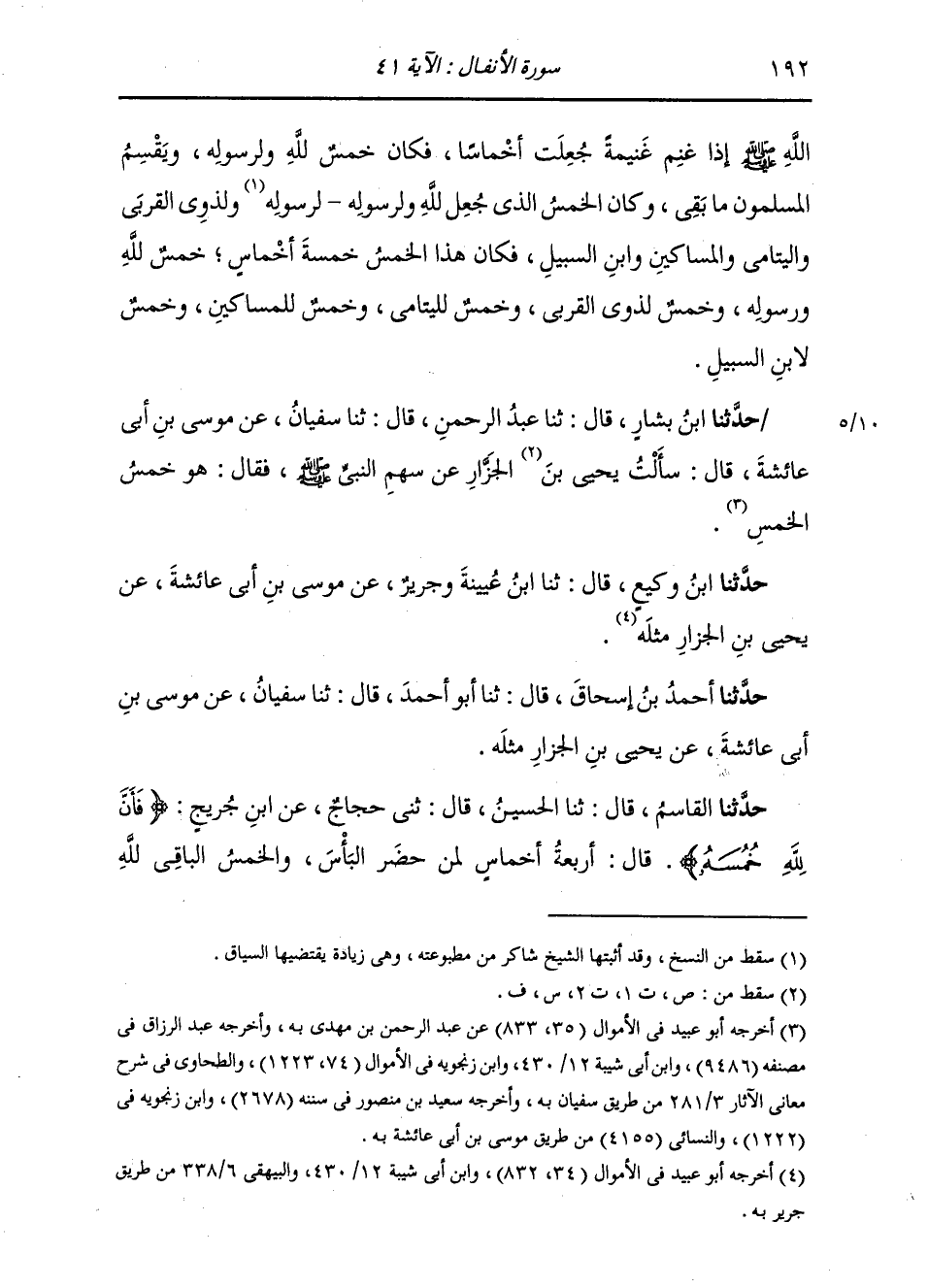 حَدَّثَنَا ابْنُ بَشَّارٍ، قَالَ: ثنا عَبْدُ الرَّحْمَنِ،. قَالَ: ثنا سُفْيَانُ، عَنْ مُوسَى بْنِ أَبِي عَائِشَةَ، قَالَ: سَأَلْتُ يَحْيَى بْنَ الْجَزَّارِ عَنْ سَهْمِ النَّبِيِّ صَلَّى اللهُ عَلَيْهِ وَسَلَّمَ، فَقَالَ: «§هُوَ خُمُسُ الْخُمُسِ» . حَدَّثَنَا ابْنُ وَكِيعٍ. قَالَ: ثنا ابْنُ عُيَيْنَةَ، وَجَرِيرٌ عَنْ مُوسَى بْنِ أَبِي عَائِشَةَ، عَنْ يَحْيَى بْنِ الْجَزَّارِ مِثْلَهُ. حَدَّثَنَا أَحْمَدُ بْنُ إِسْحَاقَ، قَالَ: ثنا أَبُو أَحْمَدَ. قَالَ: ثنا سُفْيَانُ، عَنْ مُوسَى بْنِ أَبِي عَائِشَةَ، عَنْ يَحْيَى بْنِ الْجَزَّارِ مِثْلَهُ