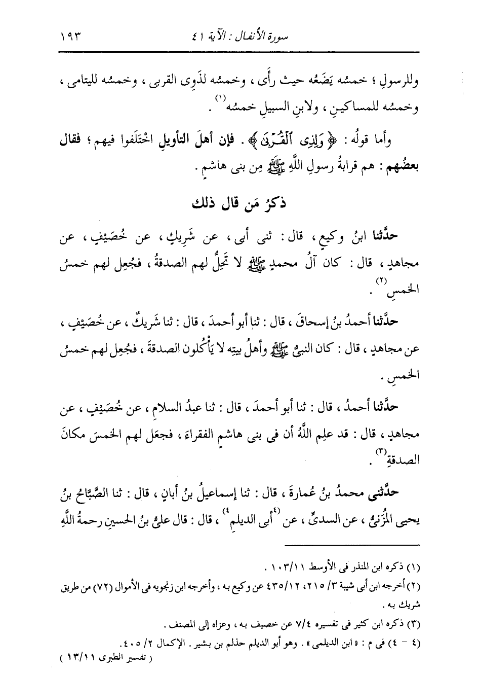 §وَأَمَّا قَوْلُهُ: {وَلِذِي الْقُرْبَى} [الأنفال: 41] فَإِنَّ أَهْلَ التَّأْوِيلِ اخْتَلَفُوا فِيهِمْ، فَقَالَ بَعْضُهُمْ: هُمْ قَرَابَةُ رَسُولِ اللَّهِ صَلَّى اللهُ عَلَيْهِ وَسَلَّمَ مِنْ بَنِي هَاشِمٍ