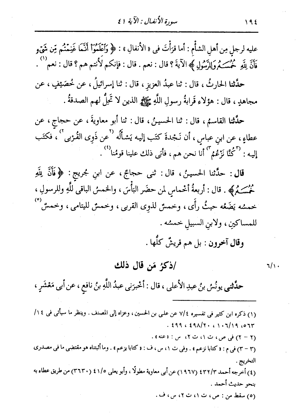 ذِكْرُ مَنْ قَالَ ذَلِكَ: حَدَّثَنِي يُونُسُ بْنُ عَبْدِ الْأَعْلَى، قَالَ: أَخْبَرَنِي عَبْدُ اللَّهِ بْنُ نَافِعٍ، عَنْ أَبِي مَعْشَرٍ، -[195]- عَنْ سَعِيدٍ الْمَقْبُرِيِّ، قَالَ: كَتَبَ نَجْدَةُ إِلَى ابْنِ عَبَّاسٍ يَسْأَلُهُ عَنْ ذِي الْقُرْبَى، قَالَ: فَكَتَبَ إِلَيْهِ ابْنُ عَبَّاسٍ: " §قَدْ كُنَّا نَقُولُ: إِنَّا هُمْ فَأَبَى ذَلِكَ عَلَيْنَا قَوْمُنَا، وَقَالُوا: قُرَيْشٌ كُلُّهَا ذَوُو قُرْبَى " وَقَالَ آخَرُونَ: سَهْمُ ذِي الْقُرْبَى كَانَ لِرَسُولِ اللَّهِ صَلَّى اللهُ عَلَيْهِ وَسَلَّمَ، ثُمَّ صَارَ مِنْ بَعْدِهِ لِوَلِيِّ الْأَمْرِ مِنْ بَعْدِهِ