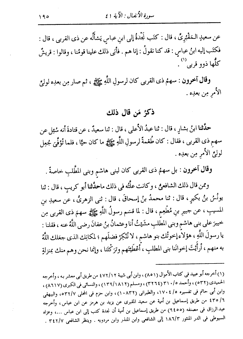 ذِكْرُ مَنْ قَالَ ذَلِكَ: حَدَّثَنَا ابْنُ بَشَّارٍ، قَالَ: ثنا عَبْدُ الْأَعْلَى، قَالَ: ثنا سَعِيدٌ، عَنْ قَتَادَةَ، أَنَّهُ سُئِلَ عَنْ سَهْمِ، ذِي الْقُرْبَى، فَقَالَ: «§كَانَ طُعْمَةً لِرَسُولِ اللَّهِ صَلَّى اللهُ عَلَيْهِ وَسَلَّمَ مَا كَانَ حَيًّا، فَلَمَّا تُوُفِّيَ جُعِلَ لِوَلِيِّ الْأَمْرِ مِنْ بَعْدِهِ» وَقَالَ آخَرُونَ: بَلْ سَهْمُ ذِي الْقُرْبَى كَانَ لِبَنِي هَاشِمٍ وَبَنِي الْمُطَّلِبِ خَاصَّةً
