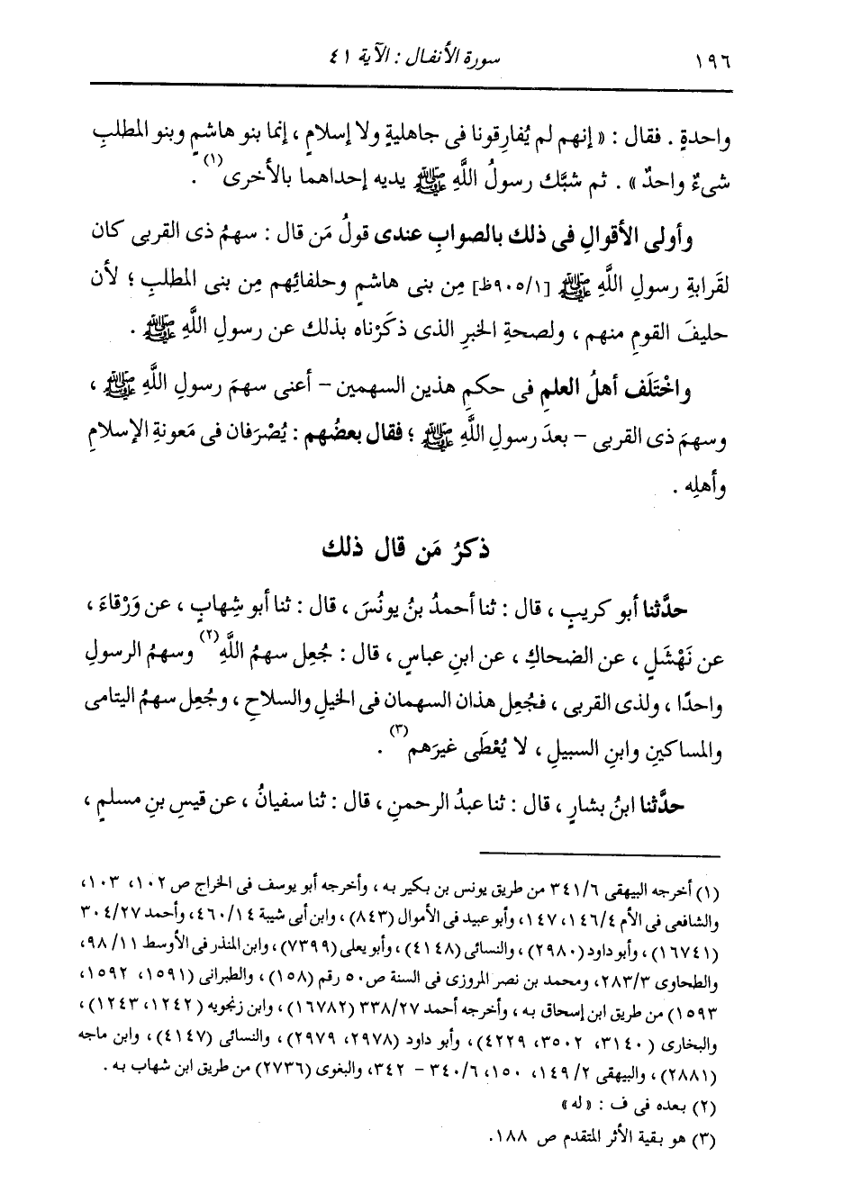 حَدَّثَنَا ابْنُ بَشَّارٍ، قَالَ: ثنا عَبْدُ الرَّحْمَنِ، قَالَ: ثنا سُفْيَانُ، عَنْ قَيْسِ بْنِ مُسْلِمٍ، -[197]- قَالَ: سَأَلْتُ الْحَسَنَ عَنْ قَوْلِ اللَّهِ: " {§وَاعْلَمُوا أَنَّمَا غَنِمْتُمْ مِنْ شَيْءٍ فَأَنَّ لِلَّهِ خُمُسَهُ وَلِلرَّسُولِ وَلِذِي الْقُرْبَى} [الأنفال: 41] قَالَ: هَذَا مِفْتَاحُ كَلَامٍ، لِلَّهِ الدُّنْيَا وَالْآخِرَةِ " ثُمَّ اخْتَلَفَ النَّاسُ فِي هَذَيْنِ السَّهْمَيْنِ بَعْدَ وَفَاةِ رَسُولِ اللَّهِ صَلَّى اللهُ عَلَيْهِ وَسَلَّمَ، فَقَالَ قَائِلُونَ: سَهْمُ النَّبِيِّ صَلَّى اللهُ عَلَيْهِ وَسَلَّمَ لَقَرَابَةِ النَّبِيِّ صَلَّى اللهُ عَلَيْهِ وَسَلَّمَ. وَقَالَ قَائِلُونَ: سَهْمُ الْقَرَابَةِ لَقَرَابَةِ الْخَلِيفَةِ، وَاجْتَمَعَ رَأْيُهُمْ أَنْ يَجْعَلُوا هَذَيْنِ السَّهْمَيْنِ فِي الْخَيْلِ وَالْعِدَّةِ فِي سَبِيلِ اللَّهِ، فَكَانَا عَلَى ذَلِكَ فِي خِلَافَةِ أَبِي بَكْرٍ وَعُمَرَ رَضِيَ اللَّهُ عَنْهُمَا حَدَّثَنَا أَحْمَدُ بْنُ إِسْحَاقَ، قَالَ: ثنا أَبُو أَحْمَدَ، قَالَ: ثنا سُفْيَانُ، عَنْ قَيْسِ بْنِ مُسْلِمٍ، قَالَ: سَأَلْتُ الْحَسَنَ بْنَ مُحَمَّدٍ، فَذَكَرَ نَحْوَهُ