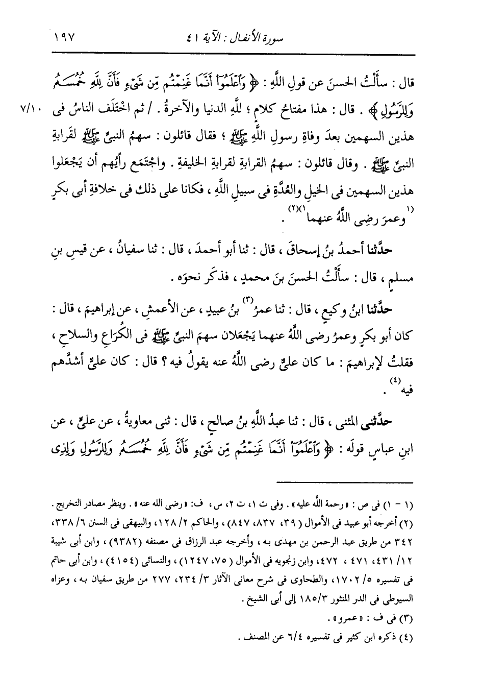 حَدَّثَنِي الْمُثَنَّى، قَالَ: ثنا عَبْدُ اللَّهِ بْنُ صَالِحٍ، قَالَ: ثني مُعَاوِيَةُ، عَنْ عَلِيٍّ، عَنِ ابْنِ عَبَّاسٍ، قَوْلُهُ: {§وَاعْلَمُوا أَنَّمَا غَنِمْتُمْ مِنْ شَيْءٍ فَأَنَّ لِلَّهِ خُمُسَهُ وَلِلرَّسُولِ وَلِذِي -[198]- الْقُرْبَى وَالْيَتَامَى وَالْمَسَاكِينِ} [الأنفال: 41] الْآيَةَ. قَالَ ابْنُ عَبَّاسٍ: فَكَانَتِ الْغَنِيمَةُ تُقْسَمُ عَلَى خَمْسَةِ أَخْمَاسٍ، أَرْبَعَةٍ بَيْنَ مَنْ قَاتَلَ عَلَيْهَا، وَخُمُسٍ وَاحِدٍ يُقْسَمُ عَلَى أَرْبَعَةٍ: لِلَّهِ، وَلِلرَّسُولِ، وَلِذِي الْقُرْبَى، يَعْنِي قَرَابَةَ النَّبِيِّ صَلَّى اللهُ عَلَيْهِ وَسَلَّمَ، فَمَا كَانَ لِلَّهِ وَلِلرَّسُولِ فَهُوَ لَقَرَابَةِ النَّبِيِّ صَلَّى اللهُ عَلَيْهِ وَسَلَّمَ، وَلَمْ يَأْخُذِ النَّبِيُّ صَلَّى اللهُ عَلَيْهِ وَسَلَّمَ مِنَ الْخُمُسِ شَيْئًا. فَلَمَّا قَبَضَ اللَّهُ رَسُولَهُ صَلَّى اللهُ عَلَيْهِ وَسَلَّمَ، رَدَّ أَبُو بَكْرٍ رَضِيَ اللَّهُ عَنْهُ نَصِيبَ الْقَرَابَةِ فِي الْمُسْلِمِينَ، فَجَعَلَ يَحْمِلُ بِهِ فِي سَبِيلِ اللَّهِ؛ لِأَنَّ رَسُولَ اللَّهِ صَلَّى اللهُ عَلَيْهِ وَسَلَّمَ، قَالَ: «لَا نُورَثُ، مَا تَرَكْنَا صَدَقَةٌ»