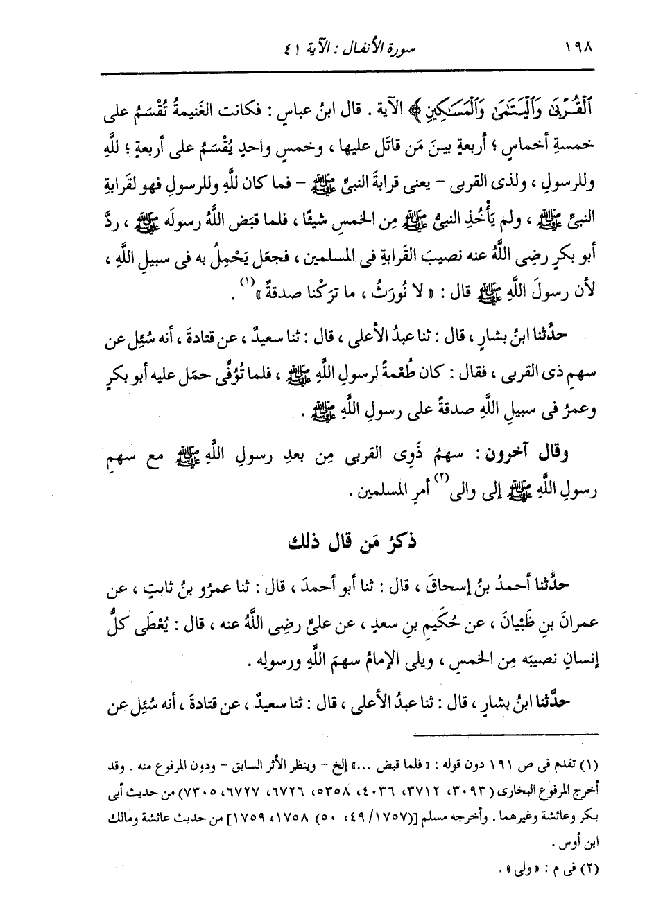 حَدَّثَنَا ابْنُ بَشَّارٍ، قَالَ: ثنا عَبْدُ الْأَعْلَى، قَالَ: ثنا سَعِيدٌ، عَنْ قَتَادَةَ: أَنَّهُ سُئِلَ عَنْ سَهْمِ ذِي الْقُرْبَى، فَقَالَ: «§كَانَ طُعْمَةً لِرَسُولِ اللَّهِ صَلَّى اللهُ عَلَيْهِ وَسَلَّمَ، فَلَمَّا تُوُفِّيَ حَمَلَ عَلَيْهِ أَبُو بَكْرٍ وَعُمَرُ فِي سَبِيلِ اللَّهِ صَدَقَةً عَلَى رَسُولِ اللَّهِ صَلَّى اللهُ عَلَيْهِ وَسَلَّمَ» وَقَالَ آخَرُونَ: سَهْمُ ذَوِي الْقُرْبَى مِنْ بَعْدِ رَسُولِ اللَّهِ صَلَّى اللهُ عَلَيْهِ وَسَلَّمَ مَعَ سَهْمِ رَسُولِ اللَّهِ صَلَّى اللهُ عَلَيْهِ وَسَلَّمَ إِلَى وَلِيِّ أَمْرِ الْمُسْلِمِينَ