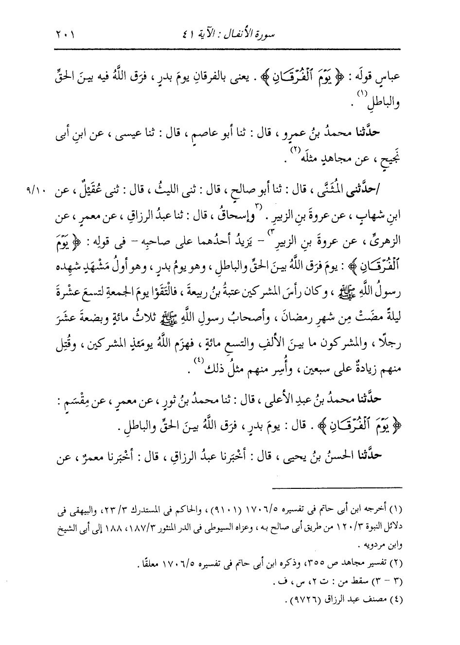 حَدَّثَنِي الْمُثَنَّى، قَالَ: ثنا أَبُو صَالِحٍ، قَالَ: ثني اللَّيْثُ، قَالَ: ثني عُقَيْلٌ، عَنِ ابْنِ شِهَابٍ، عَنْ عُرْوَةَ بْنِ الزُّبَيْرِ وَإِسْحَاقَ، قَالَ: ثنا عَبْدُ الرَّزَّاقِ، عَنْ مَعْمَرٍ، عَنِ الزُّهْرِيِّ، عَنْ عُرْوَةَ بْنِ الزُّبَيْرِ، يَزِيدُ أَحَدُهُمَا عَلَى صَاحِبِهِ فِي قَوْلِهِ: " {§يَوْمَ الْفُرْقَانِ} [الأنفال: 41] يَوْمَ فَرَّقَ اللَّهُ بَيْنَ الْحَقِّ وَالْبَاطِلِ، وَهُوَ يَوْمُ بَدْرٍ، وَهُوَ أَوَّلُ مَشْهَدٍ شَهِدَهُ رَسُولُ اللَّهِ صَلَّى اللهُ عَلَيْهِ وَسَلَّمَ، وَكَانَ رَأْسَ الْمُشْرِكِينَ عُتْبَةُ بْنُ رَبِيعَةَ. فَالْتَقَوْا يَوْمَ الْجُمُعَةِ لِتَسْعَ عَشْرَةَ لَيْلَةً مَضَتْ مِنْ شَهْرِ رَمَضَانَ، وَأَصْحَابُ رَسُولِ اللَّهِ صَلَّى اللهُ عَلَيْهِ وَسَلَّمَ ثَلَاثُمِائَةٍ وَبِضْعَةَ عَشَرَ رَجُلًا، وَالْمُشْرِكُونَ مَا بَيْنَ الْأَلْفِ وَالتِّسْعِمِائَةِ، فَهَزَمَ اللَّهُ يَوْمَئِذٍ الْمُشْرِكِينَ، وَقُتِلَ مِنْهُمْ زِيَادَةٌ عَلَى سَبْعِينَ، وَأُسِرَ مِنْهُمْ مِثْلُ ذَلِكَ "
