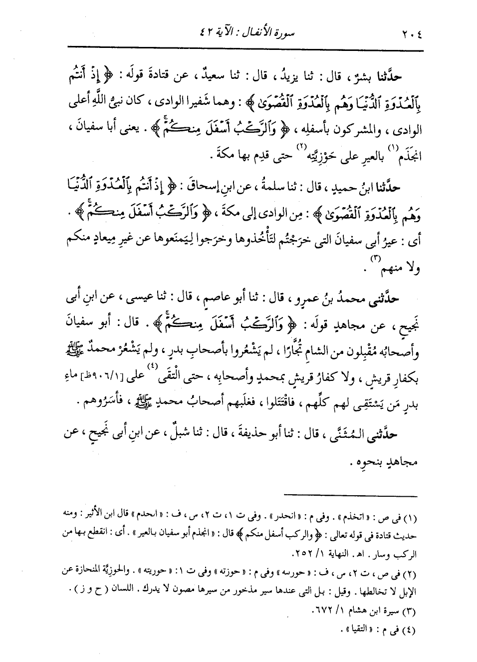حَدَّثَنِي مُحَمَّدُ بْنُ عَمْرٍو، قَالَ: ثنا أَبُو عَاصِمٍ، قَالَ: ثنا عِيسَى، عَنِ ابْنِ أَبِي نَجِيحٍ، عَنْ مُجَاهِدٍ، قَوْلُهُ: " {§وَالرَّكْبُ أَسْفَلَ مِنْكُمْ} [الأنفال: 42] قَالَ: أَبُو سُفْيَانَ وَأَصْحَابُهُ مُقْبِلُونَ مِنَ الشَّامِ تُّجَّارًا، لَمْ يَشْعُرُوا بِأَصْحَابِ بَدْرٍ، وَلَمْ يَشْعُرْ مُحَمَّدٌ صَلَّى اللهُ عَلَيْهِ وَسَلَّمَ بِكُفَّارِ قُرَيْشٍ وَلَا كُفَّارُ قُرَيْشٍ بِمُحَمَّدٍ وَأَصْحَابِهِ، حَتَّى الْتَقَيَا عَلَى مَاءِ بَدْرٍ مَنْ يَسْقِي لَهُمْ كُلِّهُمْ، فَاقْتَتَلُوا، فَغَلَبَهُمْ أَصْحَابُ مُحَمَّدٍ صَلَّى اللهُ عَلَيْهِ وَسَلَّمَ، فَأَسَرُوهُمْ ". حَدَّثَنِي الْمُثَنَّى، قَالَ: ثنا أَبُو حُذَيْفَةَ، قَالَ: ثنا شِبْلٌ، عَنِ ابْنِ أَبِي نَجِيحٍ، عَنْ مُجَاهِدٍ، بِنَحْوِهِ. -[205]- حَدَّثَنِي الْمُثَنَّى، قَالَ: ثنا إِسْحَاقُ، قَالَ: ثنا عَبْدُ اللَّهِ، عَنْ وَرْقَاءَ، عَنِ ابْنِ أَبِي نَجِيحٍ، عَنْ مُجَاهِدٍ مِثْلَهُ