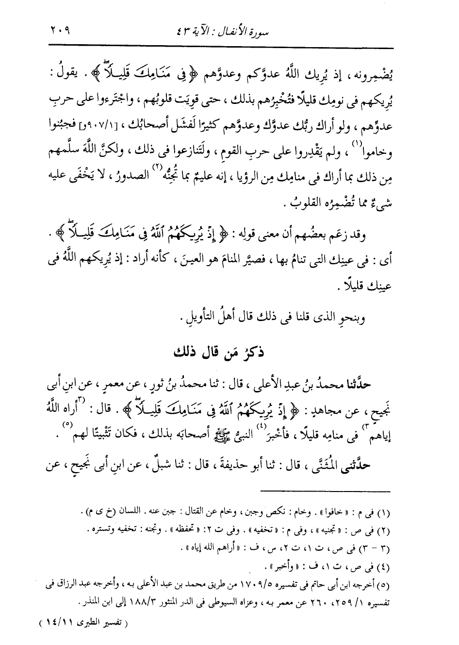 ذِكْرُ مَنْ قَالَ ذَلِكَ: حَدَّثَنَا مُحَمَّدُ بْنُ عَبْدِ الْأَعْلَى، قَالَ: ثنا مُحَمَّدُ بْنُ ثَوْرٍ، عَنْ مَعْمَرٍ، عَنِ ابْنِ أَبِي نَجِيحٍ، عَنْ مُجَاهِدٍ: " {§إِذْ يُرِيكَهُمُ اللَّهُ فِي مَنَامِكَ قَلِيلًا} [الأنفال: 43] قَالَ: أَرَاهُ اللَّهُ إِيَّاهُمْ فِي مَنَامِهِ قَلِيلًا، فَأَخْبَرَ النَّبِيُّ صَلَّى اللهُ عَلَيْهِ وَسَلَّمَ أَصْحَابَهُ بِذَلِكَ، فَكَانَ تَثْبِيتًا لَهُمْ ". حَدَّثَنِي الْمُثَنَّى، قَالَ: ثنا أَبُو حُذَيْفَةَ، قَالَ: ثنا شِبْلٌ، عَنِ ابْنِ أَبِي نَجِيحٍ، عَنْ -[210]- مُجَاهِدٍ، بِنَحْوِهِ. وَقَالَ: ثنا إِسْحَاقُ، قَالَ: ثنا عَبْدُ اللَّهِ، عَنْ وَرْقَاءَ، عَنِ ابْنِ أَبِي نَجِيحٍ، عَنْ مُجَاهِدٍ مِثْلَهُ