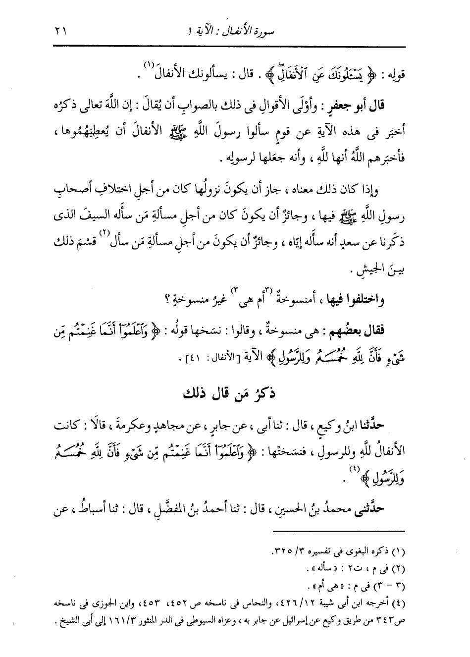 قَوْلِهِ: " {§يَسْأَلُونَكَ عَنِ الْأَنْفَالِ} [الأنفال: 1] قَالَ: يَسْأَلُونَكَ الْأَنْفَالَ " قَالَ أَبُو جَعْفَرٍ: وَأَوْلَى الْأَقْوَالِ فِي ذَلِكَ بِالصَّوَابِ أَنْ يُقَالَ: إِنَّ اللَّهَ تَعَالَى أَخْبَرَ فِي هَذِهِ الْآيَةِ عَنْ قَوْمٍ سَأَلُوا رَسُولَ اللَّهِ صَلَّى اللهُ عَلَيْهِ وَسَلَّمَ الْأَنْفَالَ أَنْ يُعْطِيَهُمُوهَا، فَأَخْبَرَهُمُ اللَّهُ أَنَّهَا لِلَّهِ وَأَنَّهُ جَعَلَهَا لِرَسُولِهِ. وَإِذَا كَانَ ذَلِكَ مَعْنَاهُ جَازَ أَنْ يَكُونَ نُزُولُهَا كَانَ مِنْ أَجْلِ اخْتِلَافِ أَصْحَابِ رَسُولِ اللَّهِ صَلَّى اللهُ عَلَيْهِ وَسَلَّمَ فِيهَا، وَجَائِزٌ أَنْ يَكُونَ كَانَ مِنْ أَجْلِ مَسْأَلَةِ مَنْ سَأَلَهُ السَّيْفَ الَّذِي ذَكَرْنَا عَنْ سَعْدٍ أَنَّهُ سَأَلَهُ إِيَّاهُ، وَجَائِزٌ أَنْ يَكُونَ مِنْ أَجْلِ مَسْأَلَةِ مَنْ سَأَلَهُ قَسْمَ ذَلِكَ بَيْنَ الْجَيْشِ. وَاخْتَلَفُوا فِيهَا، أَمَنْسُوخَةٌ هِيَ أَمْ غَيْرُ مَنْسُوخَةٍ؟ فَقَالَ بَعْضُهُمْ: هِيَ مَنْسُوخَةٌ، وَقَالُوا: نَسَخَهَا قَوْلُهُ: {وَاعْلَمُوا أَنَّمَا غَنِمْتُمْ مِنْ شَيْءٍ فَأَنَّ لِلَّهِ خُمُسَهُ وَلِلرَّسُولِ} [الأنفال: 41] الْآيَةَ