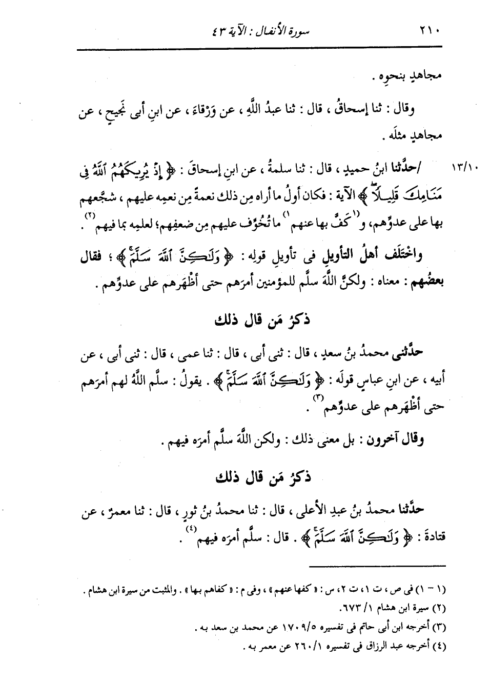 ذِكْرُ مَنْ قَالَ ذَلِكَ: حَدَّثَنِي مُحَمَّدُ بْنُ سَعْدٍ، قَالَ: ثني أَبِي، قَالَ: ثني عَمِّي، قَالَ: ثني أَبِي، عَنْ أَبِيهِ، عَنِ ابْنِ عَبَّاسٍ، قَوْلُهُ: " {§وَلَكِنَّ اللَّهَ سَلَّمَ} [الأنفال: 43] يَقُولُ: سَلَّمَ اللَّهُ لَهُمْ أَمْرَهُمْ حَتَّى أَظْهَرَهُمْ عَلَى عَدُوِّهِمْ " وَقَالَ آخَرُونَ: بَلْ مَعْنَى ذَلِكَ: وَلَكِنَّ اللَّهَ سَلَّمَ أَمْرَهُ فِيهِمْ