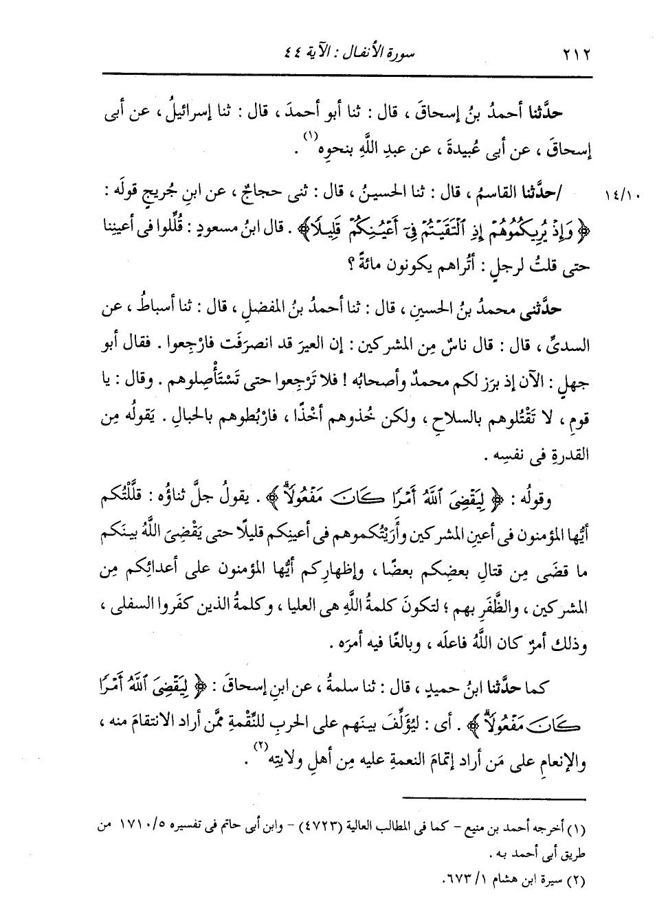 حَدَّثَنَا الْقَاسِمُ، قَالَ: ثنا الْحُسَيْنُ، قَالَ: ثني حَجَّاجٌ، عَنِ ابْنِ جُرَيْجٍ، قَوْلُهُ: " {§إِذْ يُرِيكُمُوهُمْ إِذِ الْتَقَيْتُمْ فِي أَعْيُنِكُمْ قَلِيلًا} [الأنفال: 44] قَالَ ابْنُ مَسْعُودٍ: قُلِّلُوا فِي أَعْيُنِنَا حَتَّى قُلْتُ لِرَجُلٍ: أَتَرَاهُمْ يَكُونُونَ مِائَةً؟ "