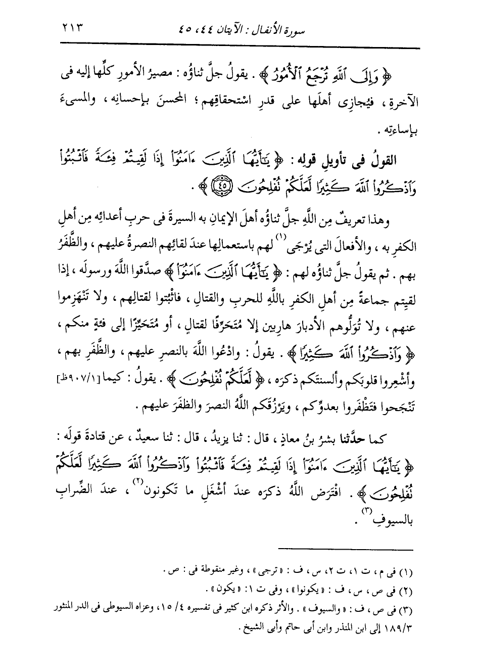 §الْقَوْلُ فِي تَأْوِيلِ قَوْلِهِ تَعَالَى: {يَا أَيُّهَا الَّذِينَ آمَنُوا إِذَا لَقِيتُمْ فِئَةً فَاثْبُتُوا وَاذْكُرُوا اللَّهَ كَثِيرًا لَعَلَّكُمْ تُفْلِحُونَ} [الأنفال: 45] وَهَذَا تعريفٌ مِنَ اللَّهِ جَلَّ ثَنَاؤُهُ أَهْلَ الْإِيمَانِ بِهِ السِّيرَةَ فِي حَرْبِ أَعْدَائِهِ مِنْ أَهْلِ الْكُفْرِ بِهِ وَالْأَفْعَالَ الَّتِي تُرْجَى لَهُمْ بِاسْتِعْمَالِهَا عِنْدَ لِقَائِهِمُ النُّصْرَةَ عَلَيْهِمْ وَالظَّفَرَ بِهِمْ، ثُمَّ يَقُولُ جَلَّ ثَنَاؤُهُ لَهُمْ: يَا أَيُّهَا الَّذِينَ آمَنُوا صَدَّقُوا اللَّهَ وَرَسُولَهُ إِذَا لَقِيتُمْ جَمَاعَةً مِنْ أَهْلِ الْكُفْرِ بِاللَّهِ لِلْحَرْبِ وَالْقِتَالِ، فَاثْبُتُوا لِقِتَالِهِمْ وَلَا تَنْهَزِمُوا عَنْهُمْ وَلَا تُوَلُّوهُمُ الْأَدْبَارَ هَارِبِينَ، إِلَّا مُتَحَرِّفًا لِقِتَالٍ أَوْ مُتَحَيِّزًا إِلَى فِئَةٍ مِنْكُمْ. {وَاذْكُرُوا اللَّهَ كَثِيرًا} [الأنفال: 45] يَقُولُ: وَادْعُوا اللَّهَ بِالنَّصْرِ عَلَيْهِمْ وَالظَّفَرِ بِهِمْ، وَأَشْعِرُوا قُلُوبَكُمْ وَأَلْسِنَتَكُمْ ذِكْرَهُ. {لَعَلَّكُمْ تُفْلِحُونَ} [البقرة: 189] يَقُولُ: كَيْمَا تَنْجَحُوا فَتَظْفَرُوا بِعَدُوِّكُمْ، وَيَرْزُقَكُمُ اللَّهُ النَّصْرَ وَالظَّفَرَ عَلَيْهِمْ