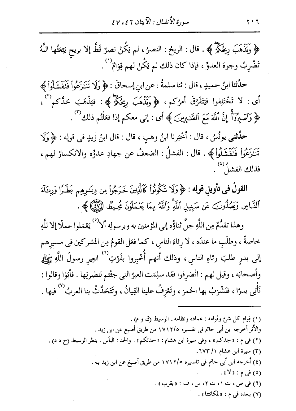 حَدَّثَنَا ابْنُ حُمَيْدٍ، قَالَ: ثنا سَلَمَةُ، عَنِ ابْنِ إِسْحَاقَ: " {§وَلَا تَنَازَعُوا فَتَفْشَلُوا} [الأنفال: 46] أَيْ لَا تَخْتَلِفُوا فَيَتَفَرَّقَ أَمْرُكُمْ. {وَتَذْهَبَ رِيحُكُمْ} [الأنفال: 46] فَيَذْهَبَ جَدُّكُمْ. {وَاصْبِرُوا إِنَّ اللَّهَ مَعَ الصَّابِرِينَ} [الأنفال: 46] أَيْ إِنِّي مَعَكُمْ إِذَا فَعَلْتُمْ ذَلِكَ "