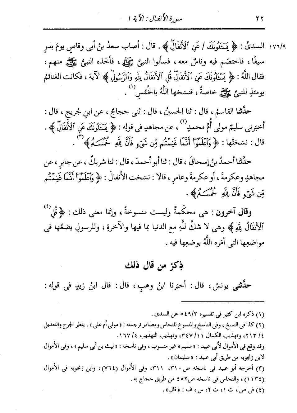 حَدَّثَنَا الْقَاسِمُ، قَالَ: ثنا الْحُسَيْنُ، قَالَ: ثني حَجَّاجٌ، عَنِ ابْنِ جُرَيْجٍ، قَالَ: أَخْبَرَنِي سُلَيْمٌ، مَوْلَى أُمِّ مُحَمَّدٍ، عَنْ مُجَاهِدٍ، فِي قَوْلِهِ: " {§يَسْأَلُونَكَ عَنِ الْأَنْفَالِ} [الأنفال: 1] قَالَ: نَسَخَتْهَا: {وَاعْلَمُوا أَنَّمَا غَنِمْتُمْ مِنْ شَيْءٍ فَأَنَّ لِلَّهِ خُمُسَهُ} [الأنفال: 41] "