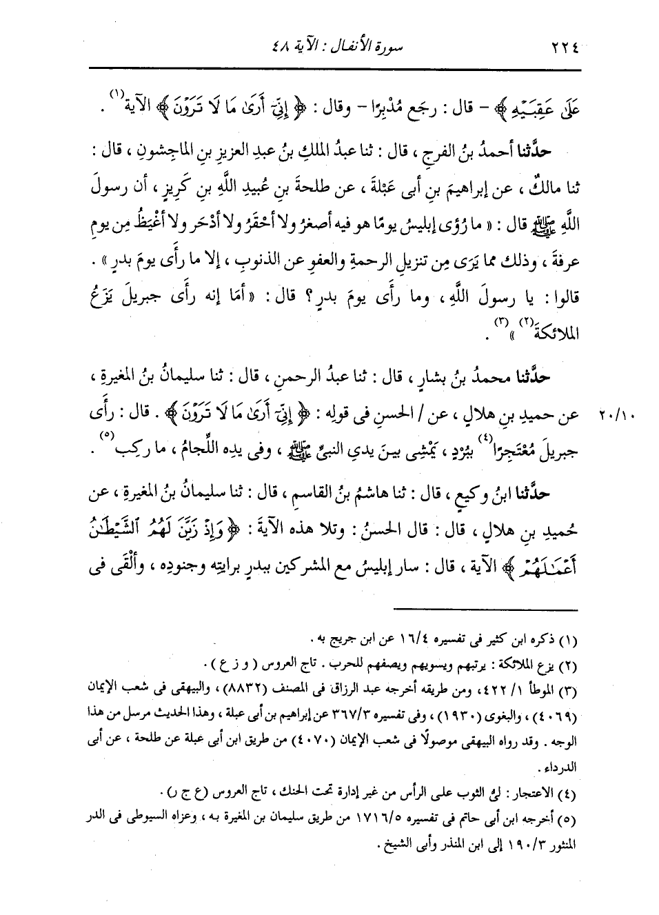 حَدَّثَنَا ابْنُ وَكِيعٍ، قَالَ: ثنا هَاشِمُ بْنُ الْقَاسِمِ، قَالَ: ثنا سُلَيْمَانُ بْنُ الْمُغِيرَةِ، عَنْ حُمَيْدِ بْنِ هِلَالٍ، قَالَ: قَالَ الْحَسَنُ: وَتَلَا هَذِهِ الْآيَةَ: " {§وَإِذْ زَيَّنَ لَهُمُ الشَّيْطَانُ أَعْمَالَهُمْ} [الأنفال: 48] الْآيَةَ، قَالَ: سَارَ إِبْلِيسُ مَعَ الْمُشْرِكِينَ بِبَدْرٍ بِرَايَتِهِ وَجُنُودِهِ، وَأَلْقَى فِي -[225]- قُلُوبِ الْمُشْرِكِينَ أَنَّ أَحَدًا لَنْ يَغْلِبَكُمْ وَأَنْتُمْ تُقَاتِلُونَ عَلَى دِينِ آبَائِكُمْ، وَلَنْ تُغْلَبُوا كَثْرَةً. فَلَمَّا الْتَقَوْا نَكَصَ عَلَى عَقِبَيْهِ، يَقُولُ: رَجَعَ مُدْبِرًا، وَقَالَ: إِنِّي بَرِيءٌ مِنْكُمْ، إِنِّي أَرَى مَا لَا تَرَوْنَ. يَعْنِي الْمَلَائِكَةَ "