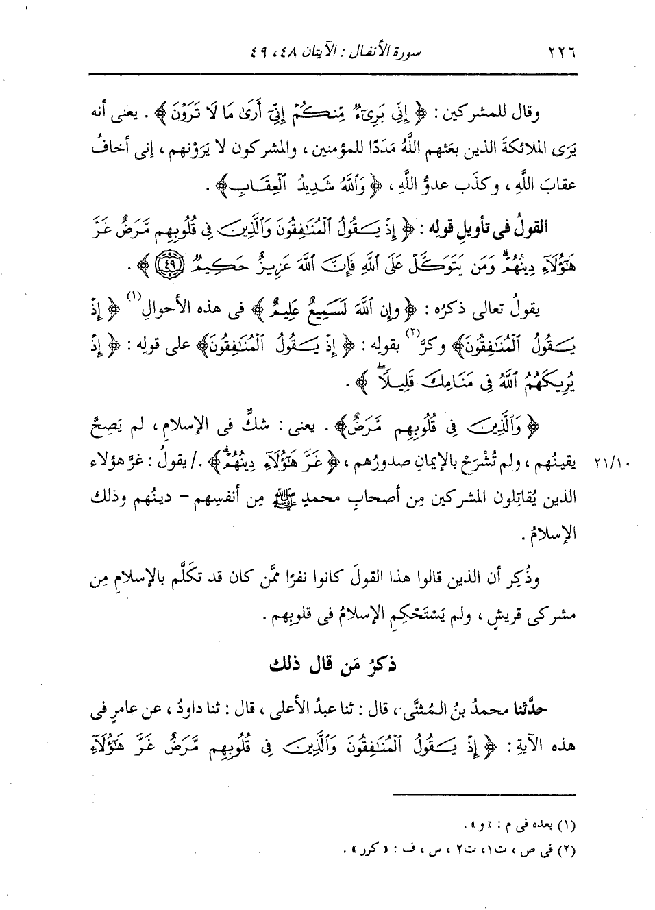ذِكْرُ مَنْ قَالَ ذَلِكَ: حَدَّثَنَا مُحَمَّدُ بْنُ الْمُثَنَّى، قَالَ: ثنا عَبْدُ الْأَعْلَى، قَالَ: ثنا دَاوُدُ، عَنْ عَامِرٍ، فِي هَذِهِ الْآيَةِ: " {§إِذْ يَقُولُ الْمُنَافِقُونَ وَالَّذِينَ فِي قُلُوبِهِمْ مَرِضٌ غَرَّ هَؤُلَاءِ -[227]- دِينُهُمْ} [الأنفال: 49] قَالَ: كَانَ نَاسٌ مِنْ أَهْلِ مَكَّةَ تَكَلَّمُوا بِالْإِسْلَامِ، فَخَرَجُوا مَعَ الْمُشْرِكِينَ يَوْمَ بَدْرٍ، فَلَمَّا رَأَوْا قِلَّةَ الْمُسْلِمِينَ قَالُوا: {غَرَّ هَؤُلَاءِ دِينُهُمْ} [الأنفال: 49] ". حَدَّثَنِي إِسْحَاقُ بْنُ شَاهِينَ، قَالَ: ثنا خَالِدٌ، عَنْ دَاوُدَ، عَنْ عَامِرٍ مِثْلَهُ