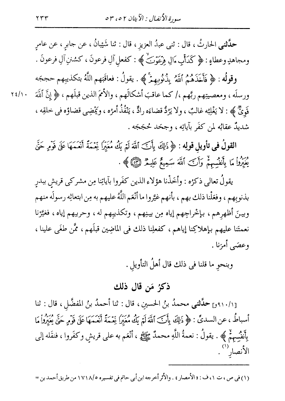 §الْقَوْلُ فِي تَأْوِيلِ قَوْلِهِ تَعَالَى: {ذَلِكَ بِأَنَّ اللَّهَ لَمْ يَكُ مُغَيِّرًا نِعْمَةً أَنْعَمَهَا عَلَى قَوْمٍ حَتَّى يُغَيِّرُوا مَا بِأَنْفُسِهِمْ وَأَنَّ اللهَ سَمِيعٌ عَلِيمٌ} [الأنفال: 53] يَقُولُ تَعَالَى ذِكْرُهُ: وَأَخَذْنَا هَؤُلَاءِ الَّذِينَ كَفَرُوا بِآيَاتِنَا مِنْ مُشْرِكِي قُرَيْشٍ بِبَدْرٍ بِذُنُوبِهِمْ وَفَعَلْنَا ذَلِكَ بِهِمْ، بِأَنَّهُمْ غَيَّرُوا مَا أَنْعَمَ اللَّهُ عَلَيْهِمْ بِهِ مِنَ ابْتِعَاثِهِ رَسُولَهُ مِنْهُمْ وَبَيْنَ أَظْهُرِهِمْ، بِإِخْرَاجِهِمْ إِيَّاهُ مِنْ بَيْنِهِمْ وَتَكْذِيبِهِمْ لَهُ وَحَرْبِهِمْ إِيَّاهُ، فَغَيَّرْنَا نِعْمَتَنَا عَلَيْهِمْ بِإِهْلَاكِنَا إِيَّاهُمْ، كَفِعْلِنَا ذَلِكَ فِي الْمَاضِينَ قَبْلَهُمْ مِمَّنْ طَغَى عَلَيْنَا وَعَصَى أَمْرَنَا. وَبِنَحْوِ مَا قُلْنَا فِي ذَلِكَ قَالَ أَهْلُ التَّأْوِيلِ